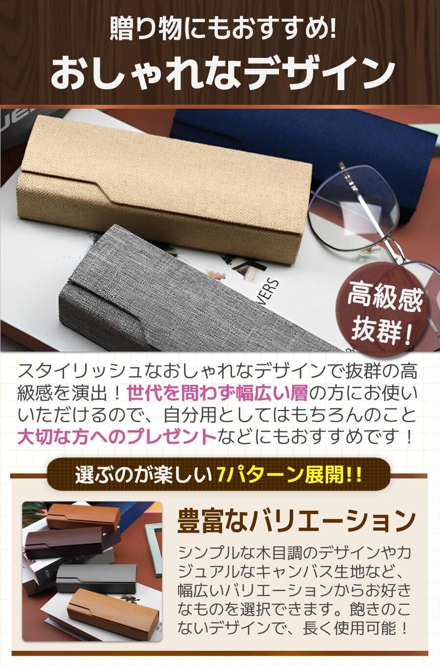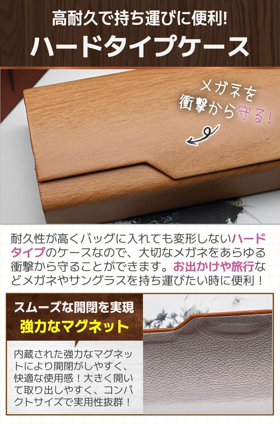 【商品特徴】①嬉しい高耐久素材:ハードタイプで持ち運びたい時に便利/②柔らかな裏地:ソフトな素材でメガネを傷つけない/③取り出しやすさ抜群:プレゼントにも最適/④大切な方へのちょっとした贈り物に!:大きく開いて出し入れがしやすい