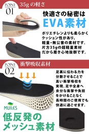 空気孔により通気性は抜群。また衝撃を吸収するEVA素材で、蒸れを抑えて1日中快適な履き心地を感じて頂けます。