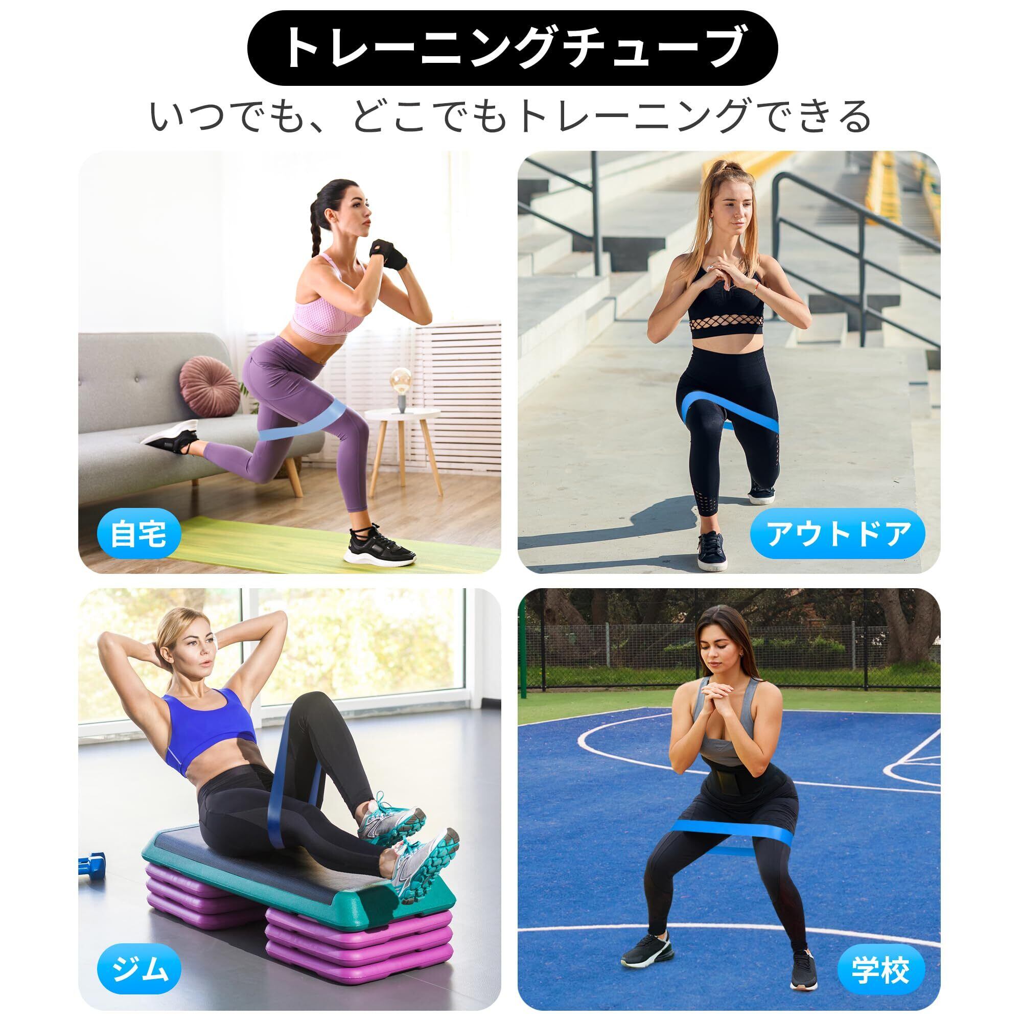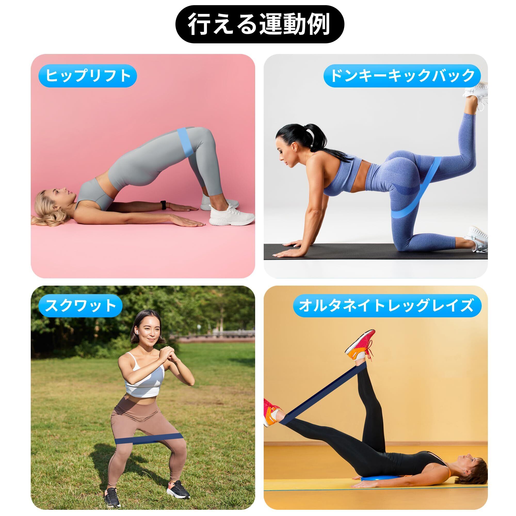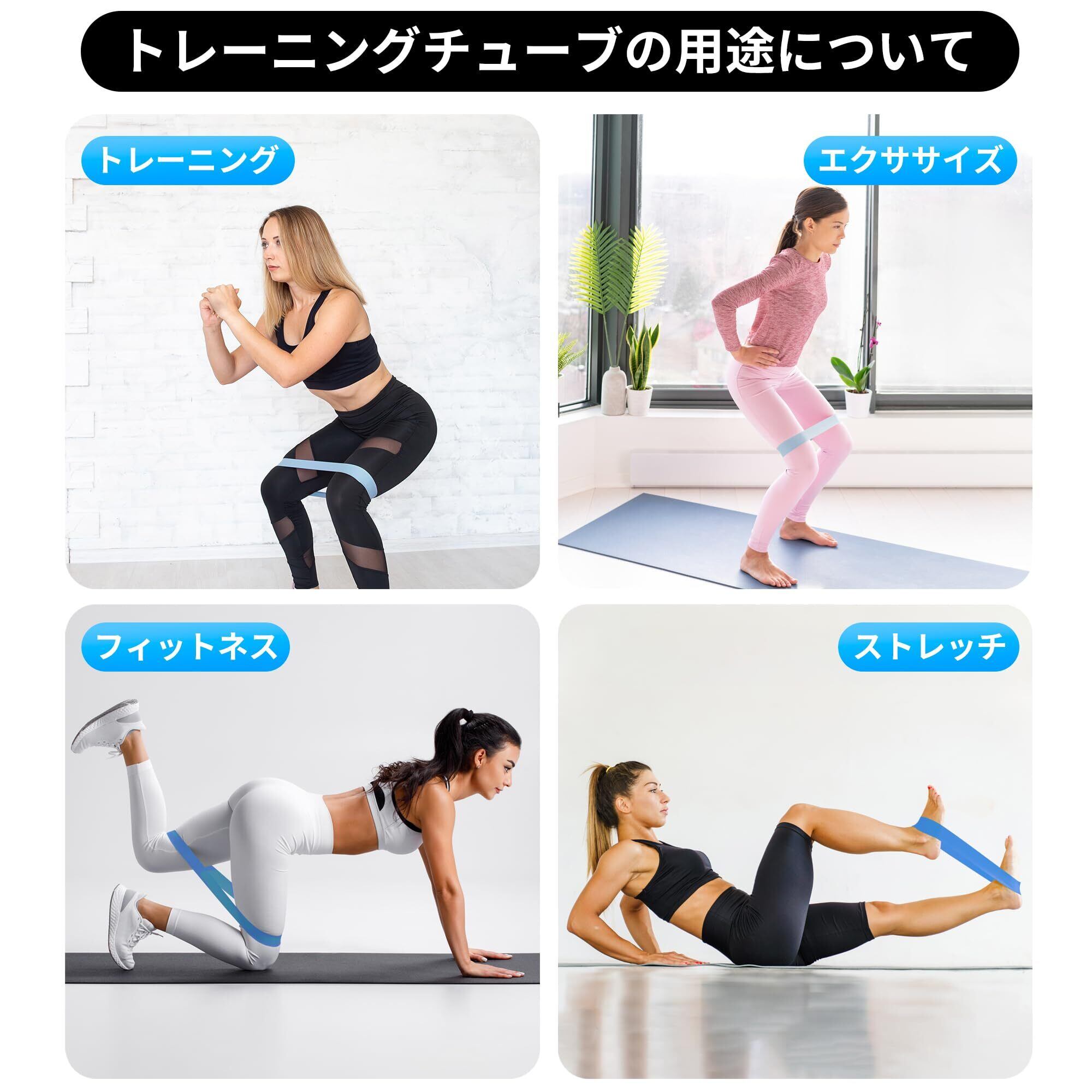 【5から59kgまで負荷が変えられます】5種類の負荷のトレーニングバンドがあり、組み合わせて自分にあった負荷を調節できます。幅が広く負荷をかけた時の安定感が抜群です。ゴムバンドは自在に伸縮できますので、筋トレ、体幹トレ、ストレッチ、美尻など幅広く活用できます。ちなみに、普段鍛えられなかった内転筋はスクワットでトレーニングできます。