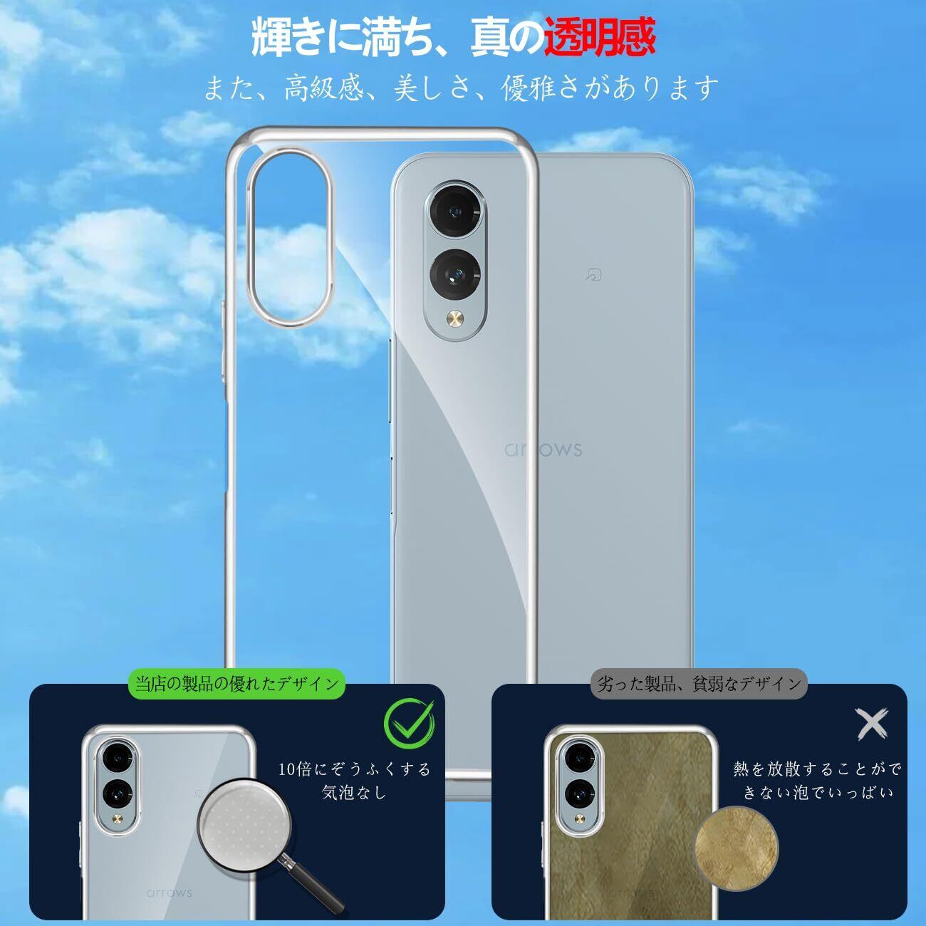 Arrows We2 F-52E 用 ケース クリア 耐衝撃 薄型 軽量 アローズ we2 カバー 透明 FCG02 A402FC M07 対応 スマホケース 高級TPU素材 メッキ加工 ソフトケース 滑り止め 持ちやすい 黄変防止 滑り止め 落下防止 ストラップホール付き(シルバー)
