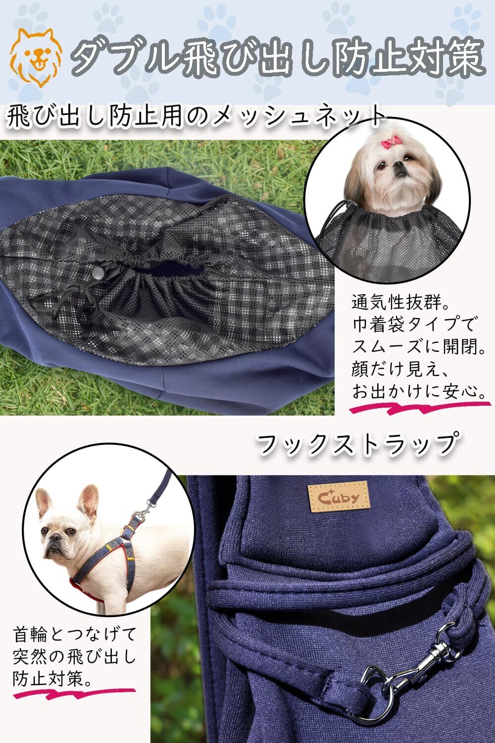 【ダブル飛び出し防止】抱っこ紐犬用は通気性抜群のメッシュネットと飛び出し防止のストラップが付き、顔だけ見え、お出かけに安心です。6kgまで対応でき中小型犬だっこひもです。