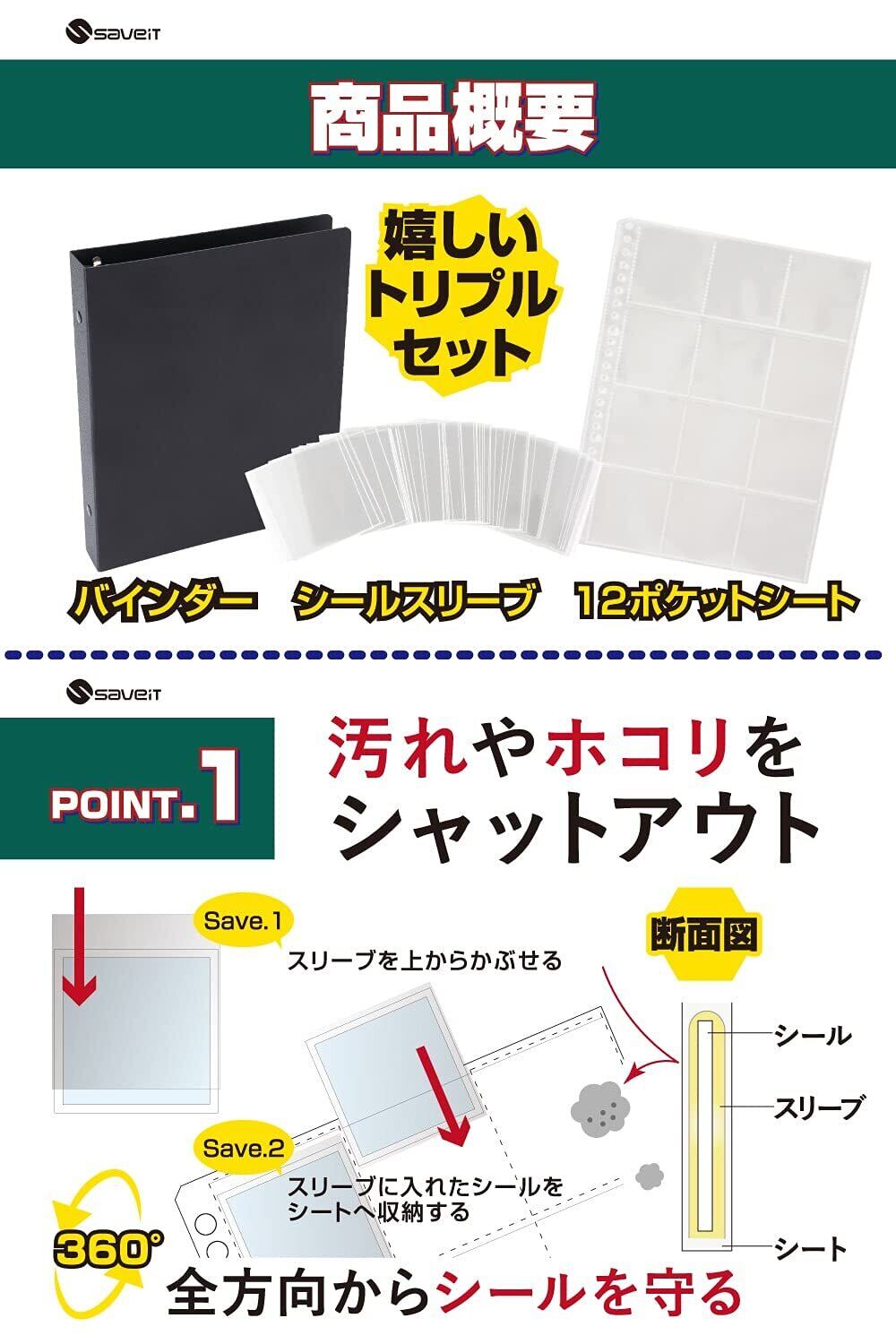 【汚れやホコリをシャットアウト!】 商品画像のようにシールスリーブを上からシールにかぶせて、その後ポケットシートに挿入していきます。ポケットシートとシールスリーブのダブル使用で汚れやホコリなどの360度全方向の侵入から大切なシールをしっかり保護・保存します。 【国内生産だから安心!】 当商品に使われているPPバインダー・12ポケットシート・シールスリーブすべて、日本国内で生産しています。すべてのともに創業50年を超えており経験豊富で各分野で実績多数の国内です。国内だから「安心・安全・高品質」「供給も安定している」「不具合に迅速に対応可能」など数々のメリットがあります。 生産工場と様々な面で距離が近いことにより、コレクターの皆様の声を反映し、改善を重ねていきやすい環境が整いました。