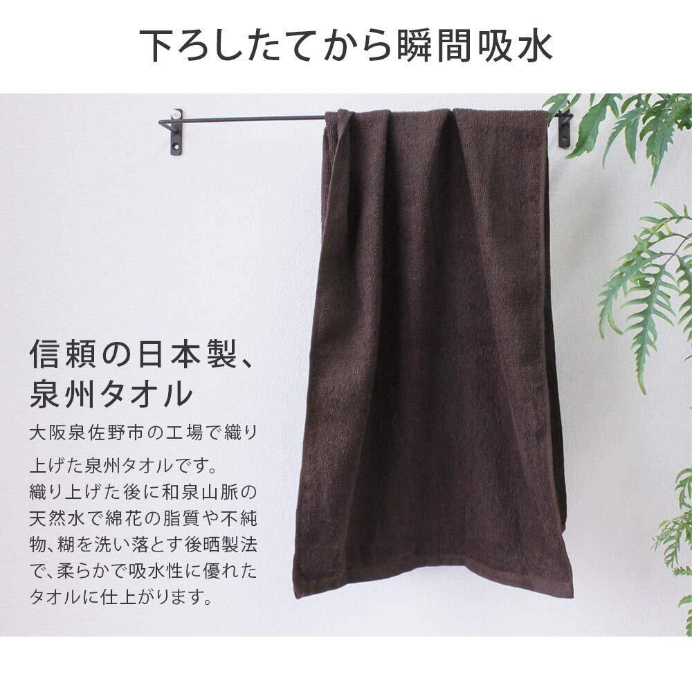 【日本製 泉州タオル】大阪泉佐野工場で織り、和泉山脈の天然水で洗い上げた泉州タオルです。タオルを織り上げてから水洗いや染色を行う泉州タオル独自の後晒製法により、使い始めから柔らかな肌触りと吸水性の良さを感じていただけます。外国製タオルが主流の昨今、身近なものだからこそこだわりたい日本製タオルです。