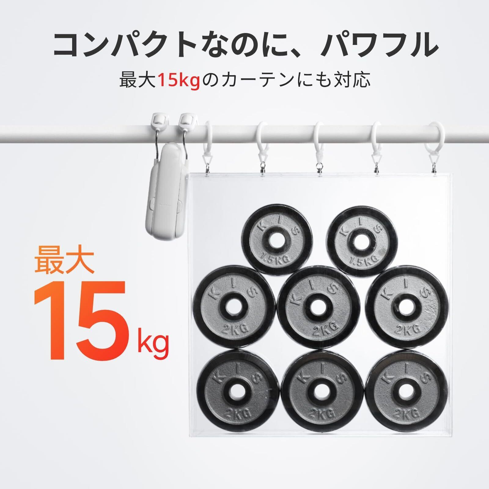 【コンパクトなのにパワフル】高性能モーターを内蔵しており、前モデル「カーテン2」と比較すると力が2倍に向上しました。最大15kgのカーテンも開閉可能です。大きな窓や重いカーテンを使用している家庭でも安心してご利用いただけます!