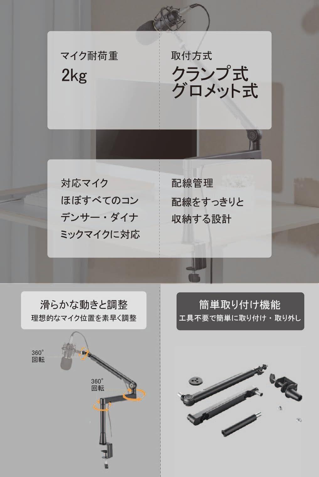 スレッドマイクホルダー:ほとんどのボーカルマイクとダイナミックマイクに適しています