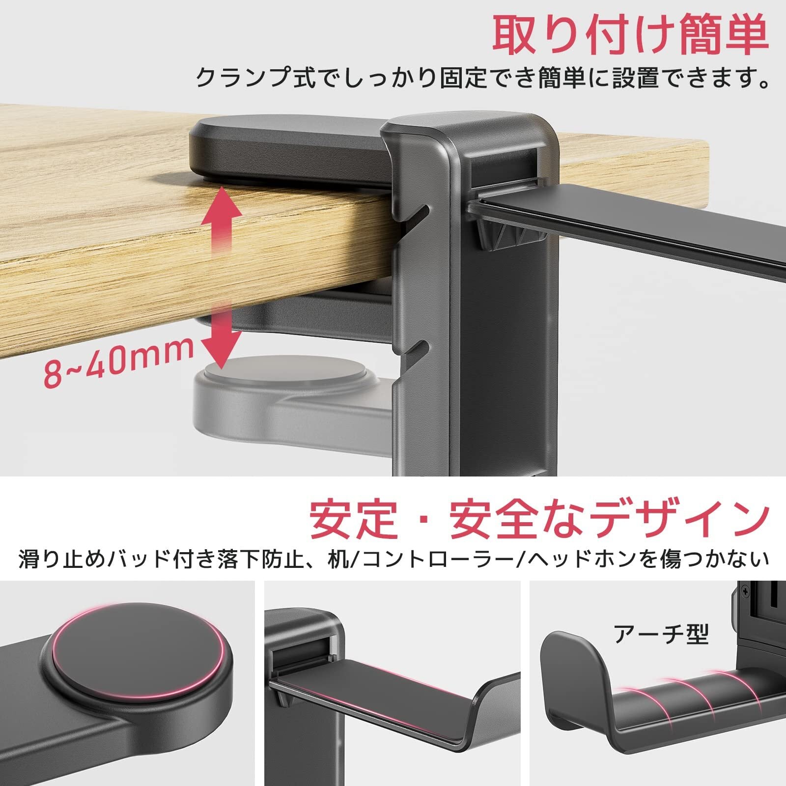 【取り付け簡単・安定性抜群】:バネ式クランプで8~40mmまでのデスク天板に挟むだけでしっかり固定できます。コントローラーフックは嵌め部に合わせて押すだけ取り付けます。クランプとフックに滑り止めシリコンパッドが付いており、デスク/コントローラーを傷つけなく、落下防止でき安定性にも優れています。