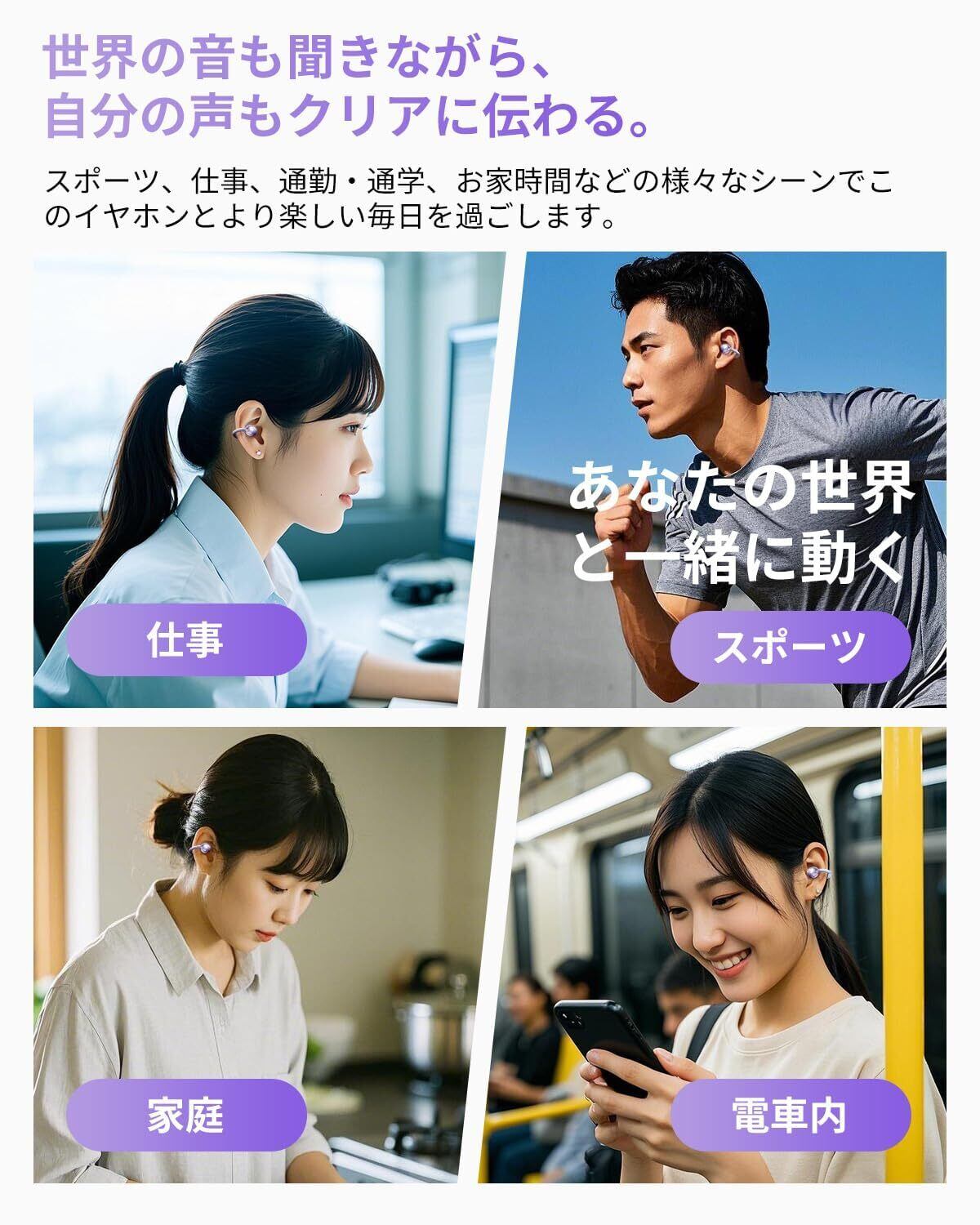 「2024年超快適 音質強化モデル イヤーカフ」イヤホン bluetooth5.4 ワイヤレスイヤホン Hi-Fi音質 音漏れ抑制 オープンイヤー型 耳を塞がない 軽量約5.6g ENC通話ノイズキャンセリング ながら聴き 耳挟み式 骨伝導の革新 人間工学設計 IPX5防水 マイク付き iOS/Android対応 通勤/通学/スポーツ/ゲーム (パープル)