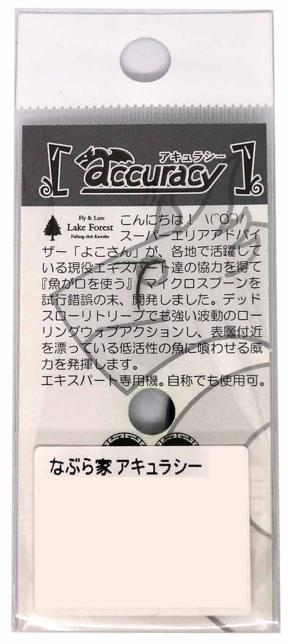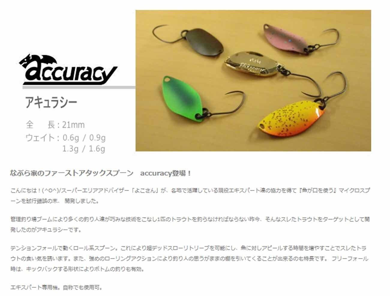 管理釣り場ブームにより多くの釣り人達が巧みな技術をこなし1匹のトラウトを釣らなければならない昨今、そんなスレたトラウトをターゲットとして開発したのがアキュラシーです。テンションフォールで動くロール系スプーン。これにより超デッドスローリトリーブを可能にし、魚に対しアピールする時間を増やすことでスレたトラウトの食い気を誘います。また、強めのローリングアクションにより釣り人の思うがままの棚を引いてくることが出来るのも特長です。 フリーフォール時は、キックバックする形状によりボトムの釣りも有効。エキスパート専用機。自称でも使用可。
