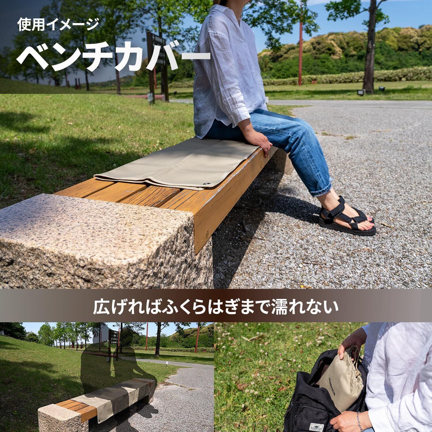 【防水これ1枚でOK】●裏面:キャンプで一晩使っても染みません。ポリウレタンコーティングが地面からの湿気を抑え、裏はびっしょり濡れても表はサラサラをキープ。泥がついても水をかければツルンと簡単に落ちるのでお手入れ簡単です。●表面:撥水性があり、水や汚れをポロポロ弾きます。濡れにくいためシートが水を吸って重くなることも防げます。