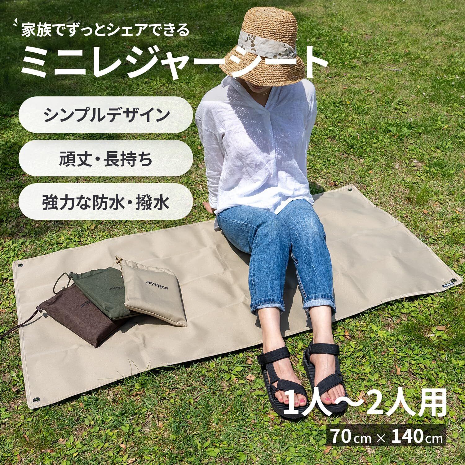 JIMENCE(ジーメンス) レジャーシート 1人 2人用 厚手 コンパクト 70×140cm 防水 両面撥水 収納袋付き (ベージュ)