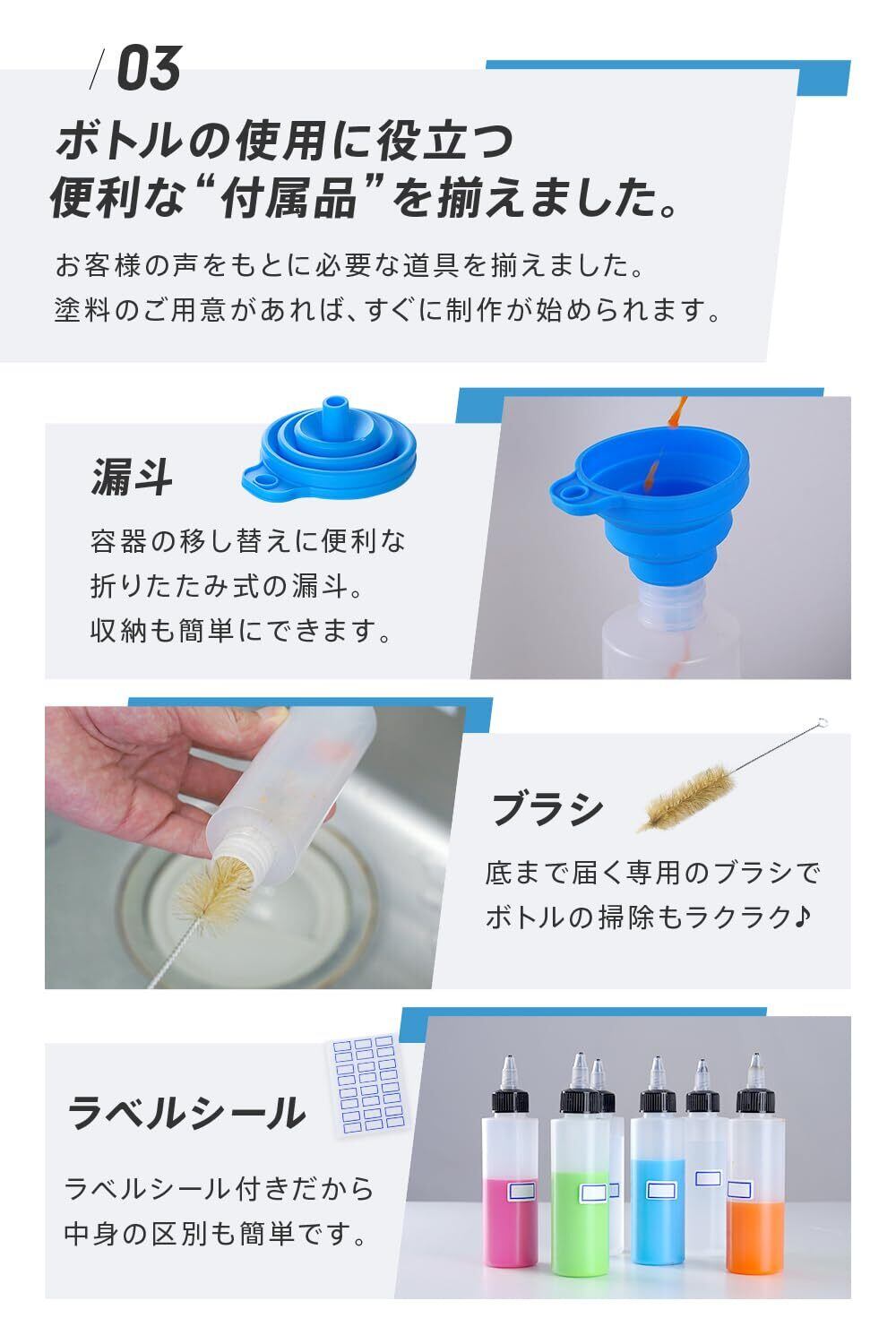 【お客様の声をもとにドロッパーボトルの使用に必要な付属品をおつけしました!】塗料の移し替えに便利な漏斗、塗料ボトルの洗浄に便利なブラシ、ボトルの識別に便利なラベルシールの3つを付属品としておつけしました。