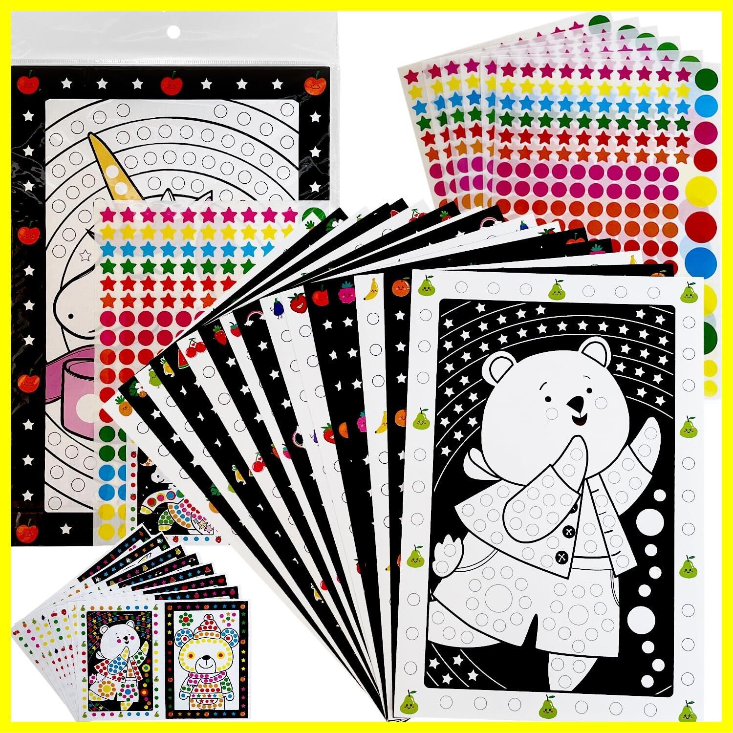 用紙のサイズ A4サイズの大きさで縦30cm、横20cm ●シールサイズ:直径20ミリ 5色 10枚 直径10ミリ 6色 248枚 星シール 6色 120枚 ●台紙:2種類 ●見本:台紙のイラストは、恐竜や動植物、妖精などのお子さんが興味を持てる可愛らしいイラストになっています。