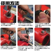 【使用方法】①付属ドリルで損傷した ネジ穴を削ります ②タップでドリル穴に ネジ穴を新たに作ります。③コイルのタング部分を 工具に差し込んでコイルを 装着します。④新たに作成したネジ山にコイルをねじ込みます。⑤ラグブレイクツールをタングにあて、鋭く叩いてタングを外します。⑥タングを外すことで、 ネジ穴が使用できるようになります