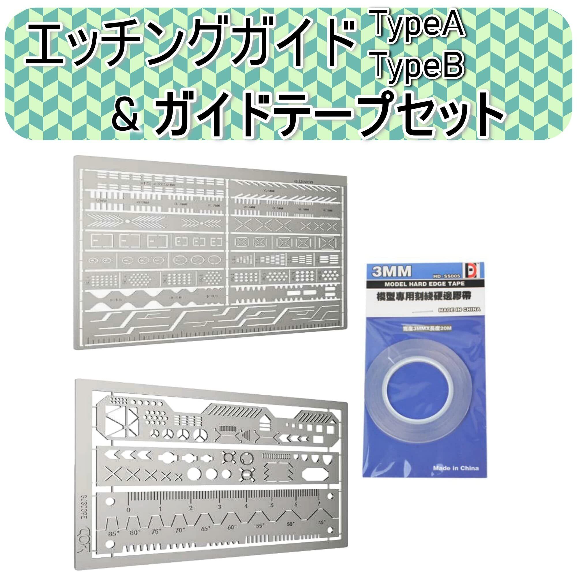 【セット内容】  エッチングガイド 2枚(Type A: 9.8cm×8.3cm / Type B: 9.8cm×6.0cm)  スジボリ用ガイドテープ 3mm×20m
