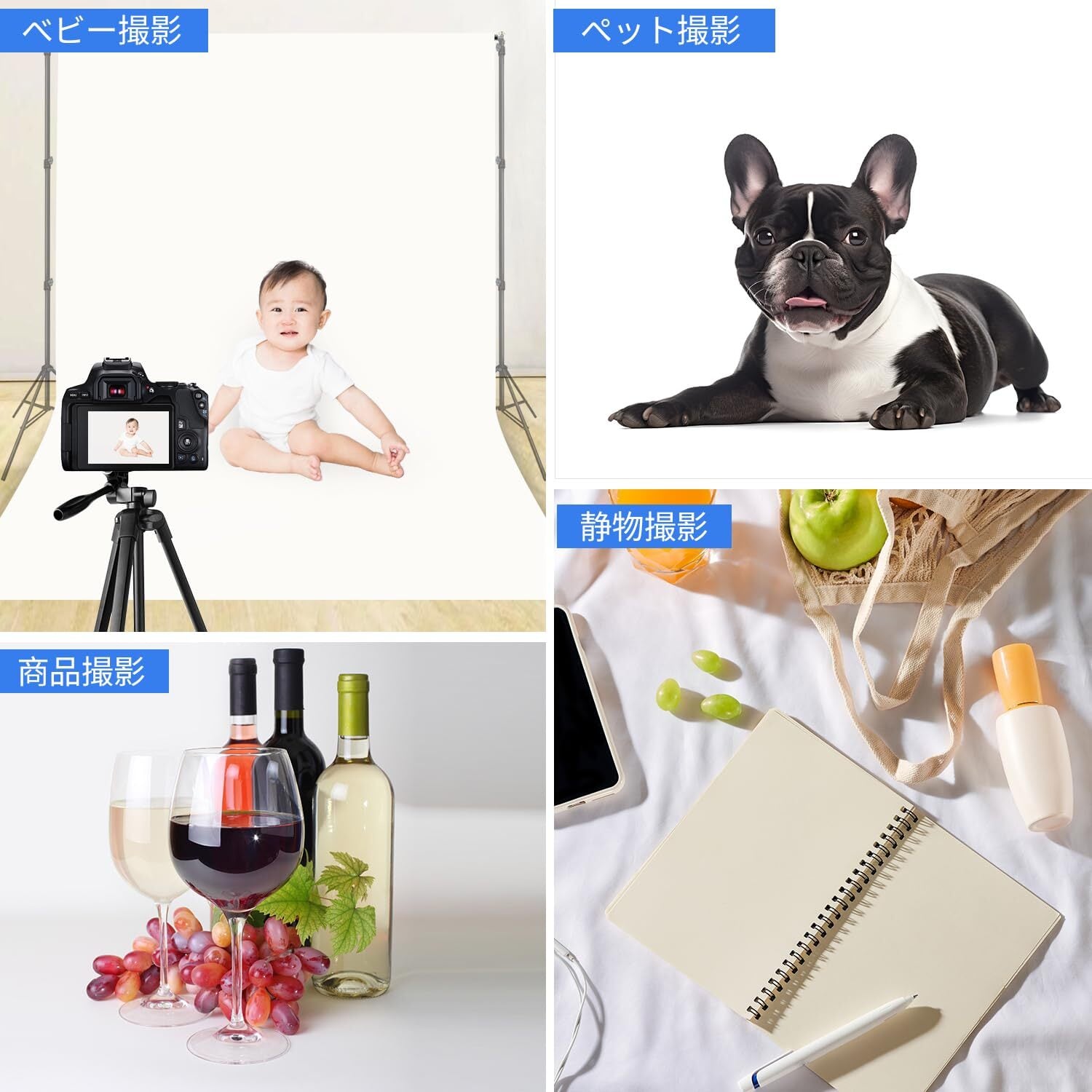 高級感のあるポリエステル材質を採用し、綿製よりシワが目立たないです。また、白い背景布は折り畳んでのお届けで、しわがあり、使用前に、アイロンをかけてください。