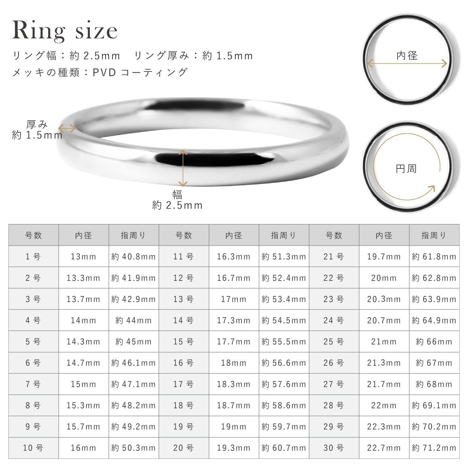 ・デザイン:表面は鏡面加工、甲丸(カマボコ)の型を採用しており、着け心地が滑らかになるよう、内側・外側部分を丸みをもたせておりますので、柔らかな指当たりとなっております。