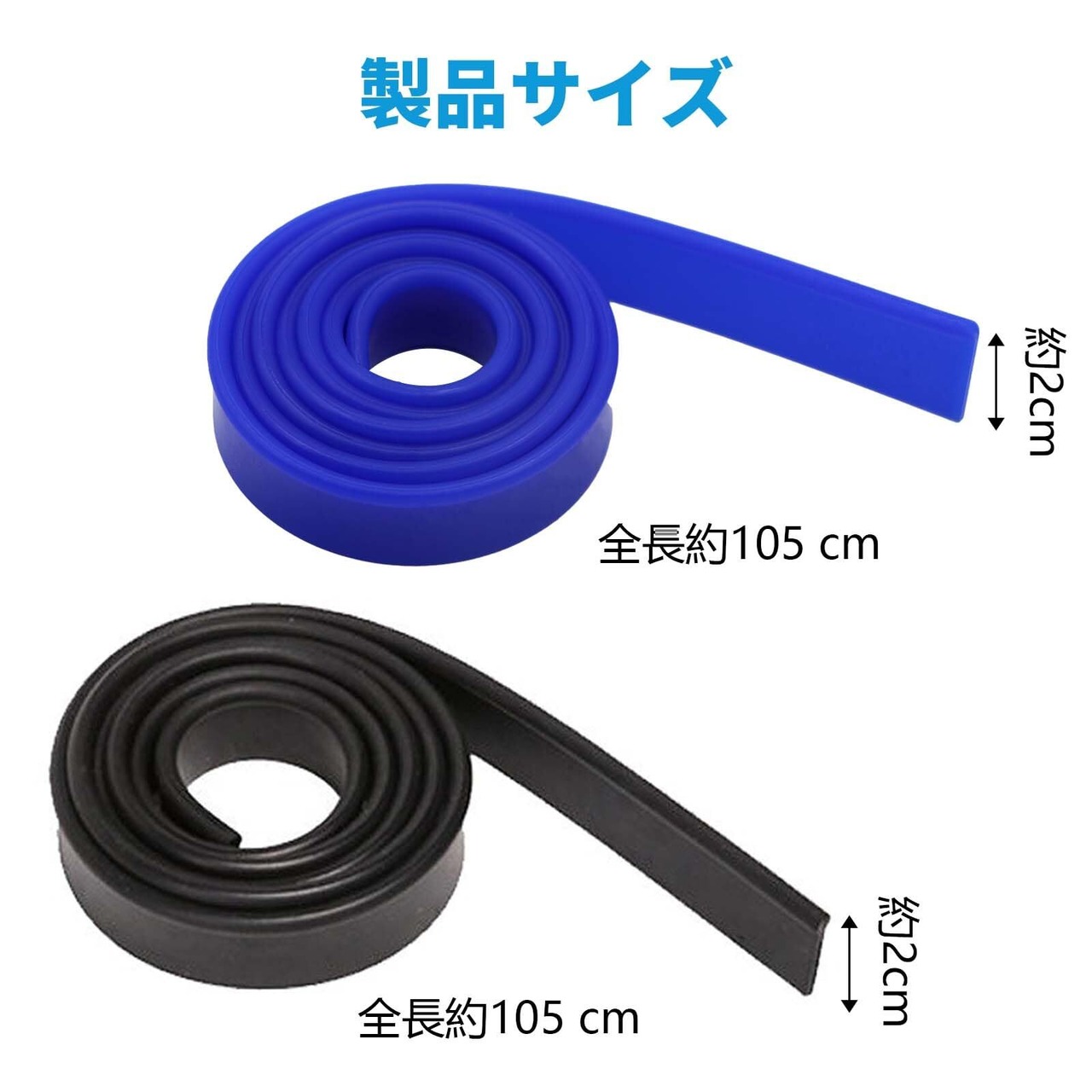 【包装】異なる色(青*1+黒*1)のガラスワイパーゴムストリップを2本お届けします。サイズ仕様は約105*2.1cmです。長さ105cmはプロの清掃業者や毎日の家庭での使用に十分で、スキージのサイズに応じてカットすることもできます。