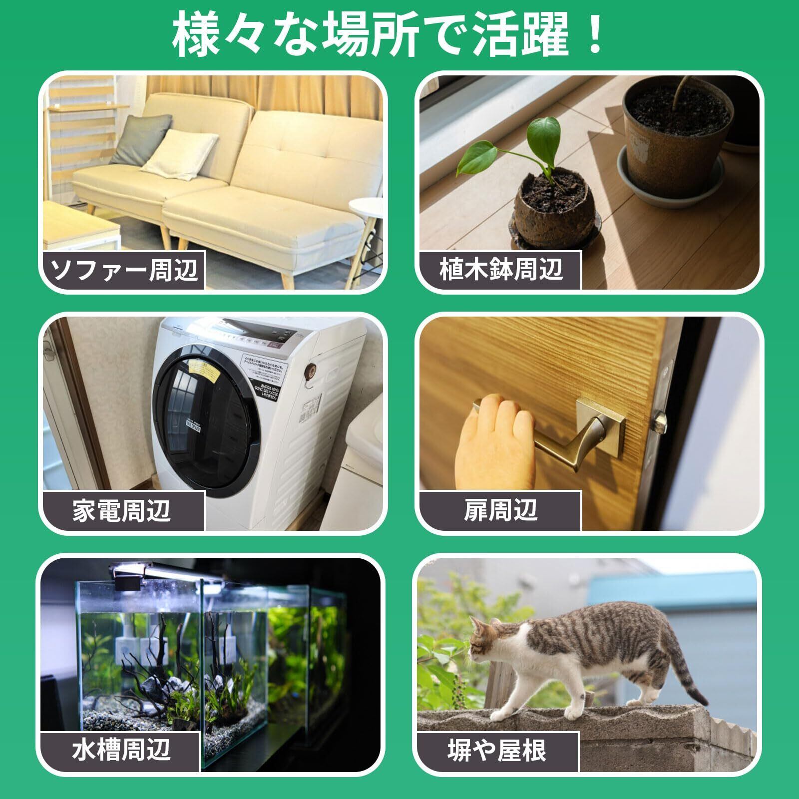 あなたの大切な場所を守る このシートは、ソファー、扉、植木、水槽、塀や屋根の上など、猫や鳥に寄ってほしくない場所に設置することができます。屋内はもちろん、屋外でも使用可能です。 ■ 自由自在な設置 トゲトゲシートは柔軟性があるので、設置したい物の形に合わせて曲げることができます。ハサミで簡単に切断できるので、好きな形に加工することも可能です。