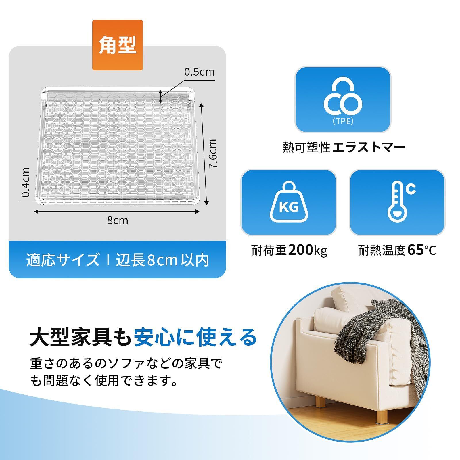 【パッケージ内容】 4個滑り止めシートが含まれており、あらゆる形状の脚に対応します。安心して家具を設置し、床面を守ります。