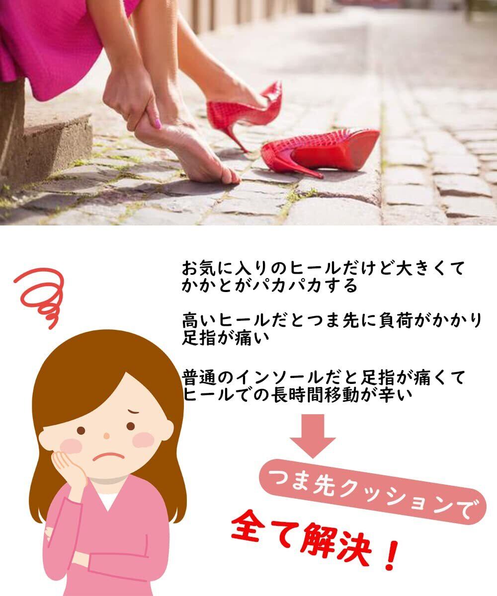 【前滑りを防止】余ったつま先部分に入れるだけ、ヒール靴を履いた時に前滑りしにくく、歩行時も立った時もつま先の圧力を分散し負荷を軽減するので、痛みを和らげて足を保護します。