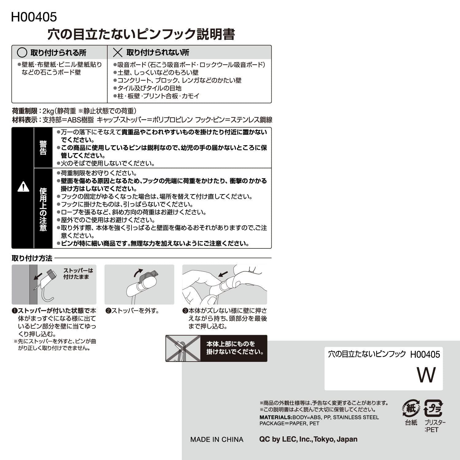 [レック(LEC) 穴の目立たない ピンフック 3個入 耐荷重 2kg ホワイト]