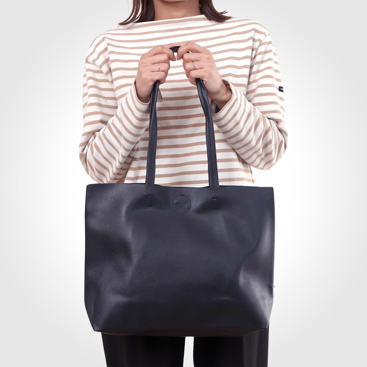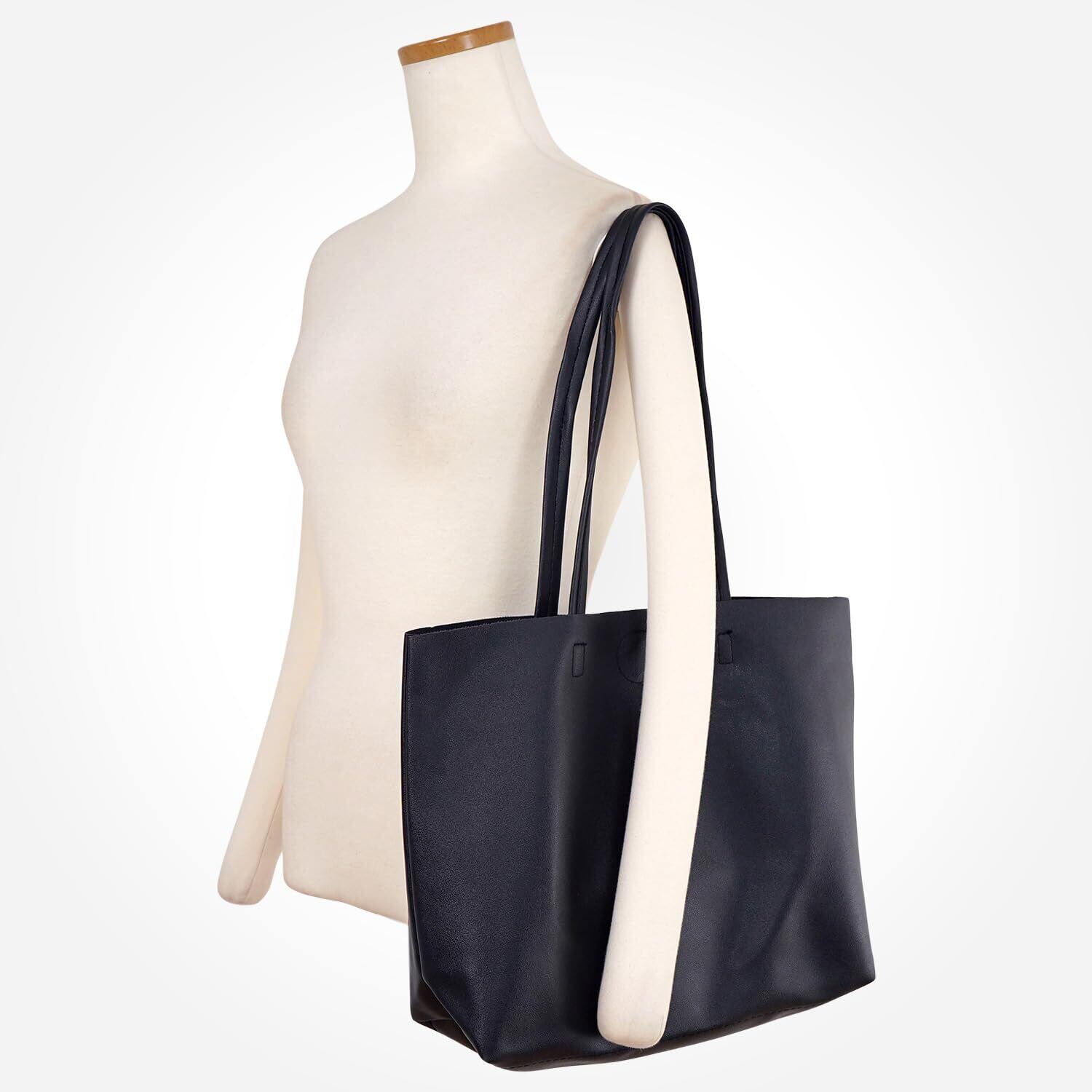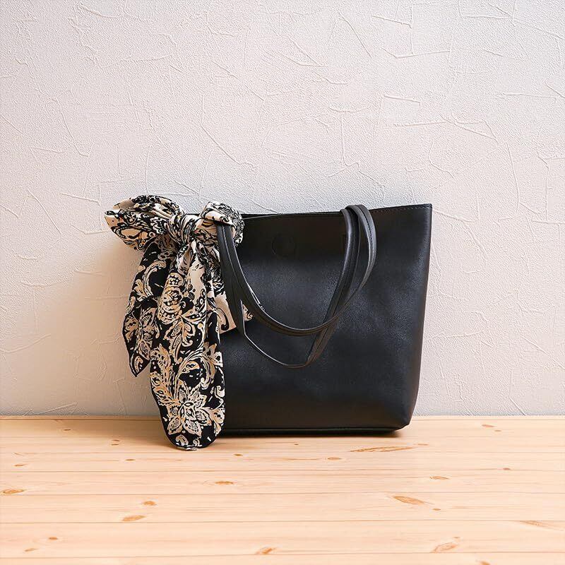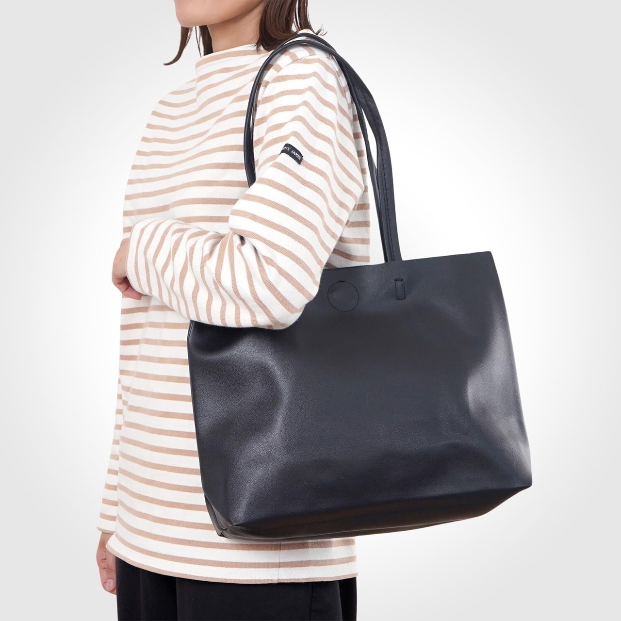 どんなシーンにも使える黒色無地のトートバッグです。PUレザーで柔らかく軽く、17インチのPCも入るぐらい大容量です。内側にはファスナーポケットが一か所あり鍵などの小物を入れるのに便利。マグネットで軽く閉められる仕様です。