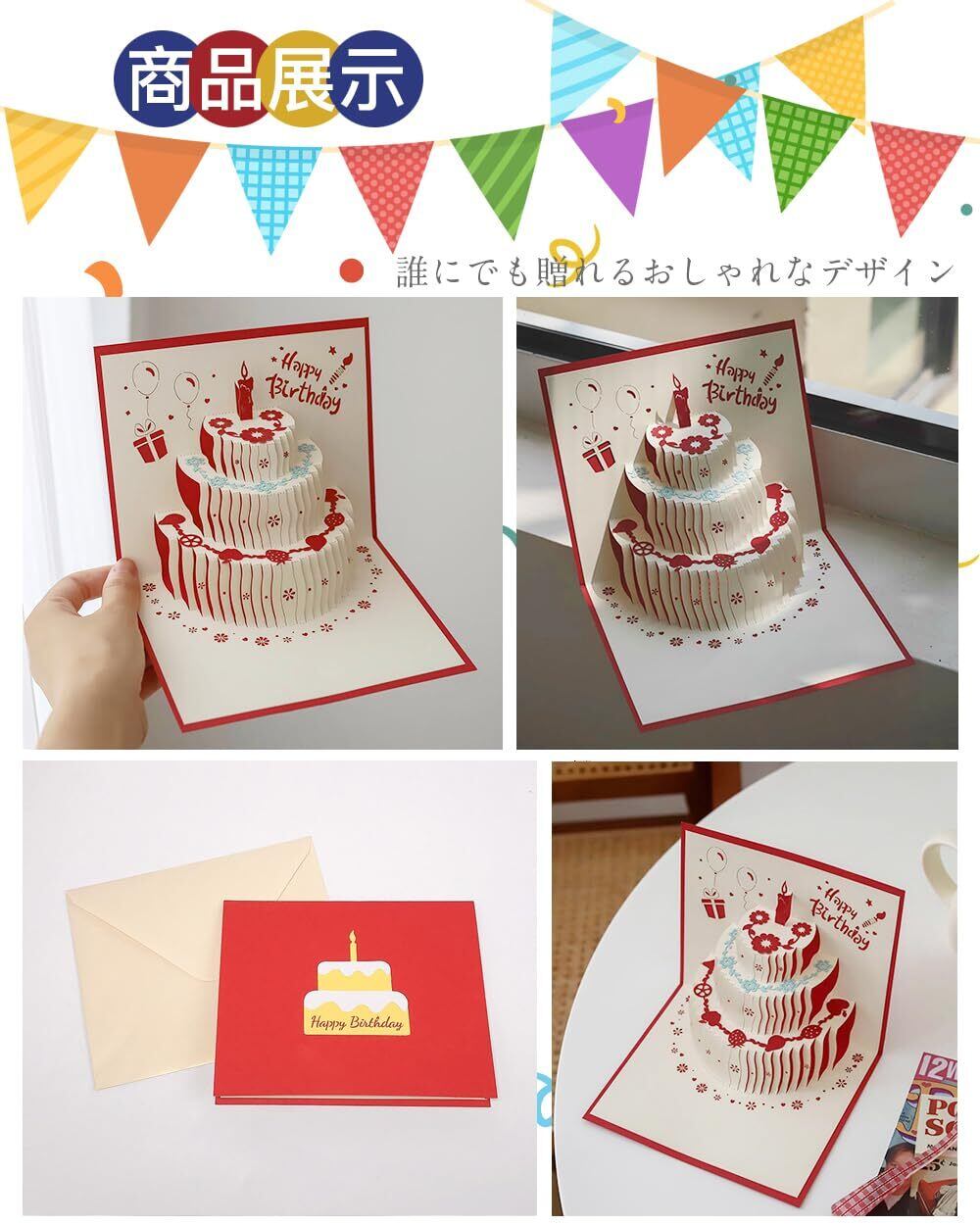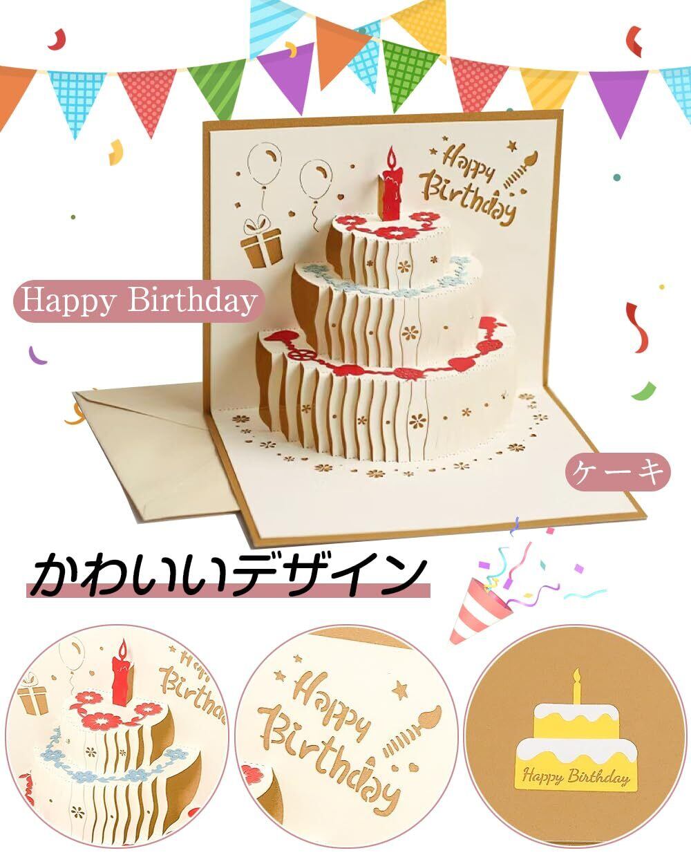 カードを開くと立体的にバースデーケーキや「Happy Birthday」の文字が飛び出します。カラフルで華やかなデザインで、贈る相手に合った自分らしいカードを選ぶことができます。