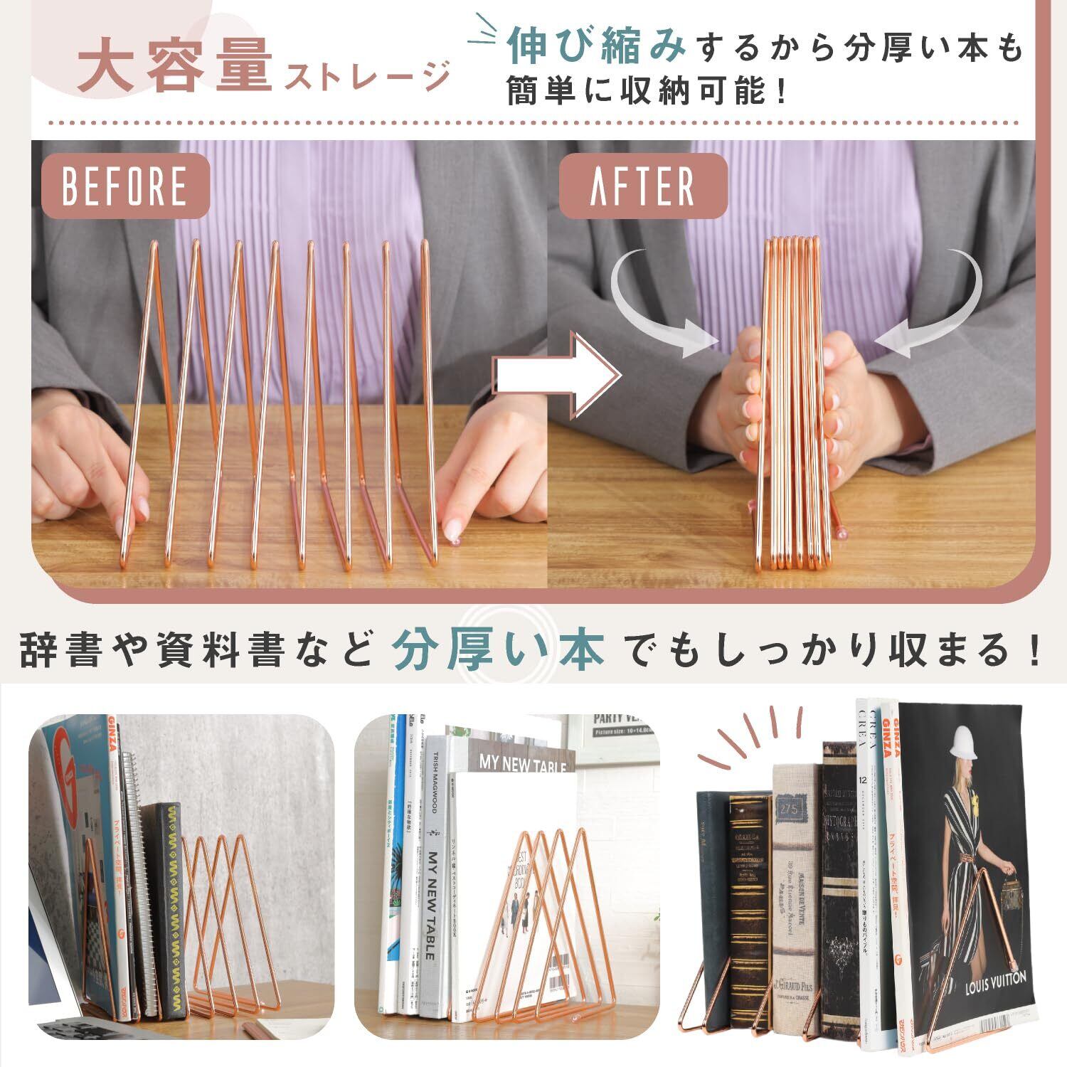 【伸縮自在】若干厚い本でも大丈夫!バネのように伸ばせるので、3cm程度の本なら収納できます。(伸ばしすぎると変形することがあります。)