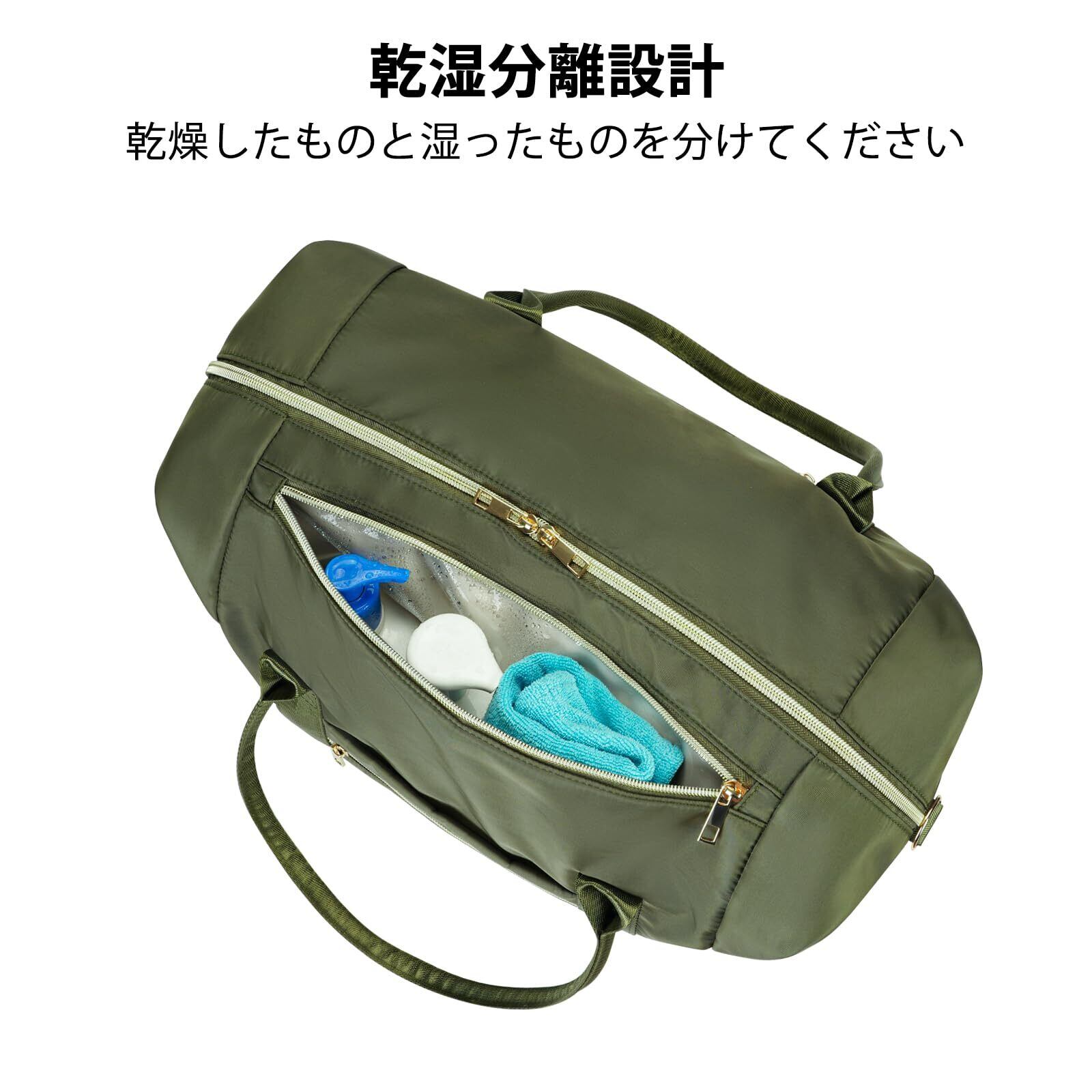【乾湿分離ポケットとシューズポケット】乾湿分離ポケットは、乾いたアイテムと湿ったアイテムを分けるのに役立ちます。さらに、シューズ巾着袋でさまざまな種類の靴を簡単に収納で来ます。