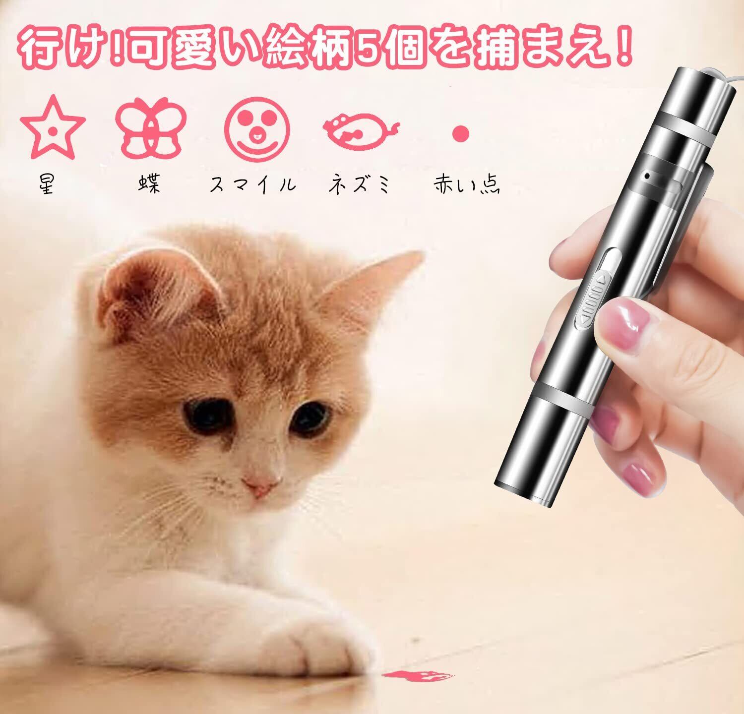 【7in1多機能 猫 おもちゃ】このおもちゃは、5種類の模様(ネズミ、チョウ、笑顔、点、五角星)に切り替えることができます。さらに、UVランプを使って蚤検査をすることができ、緊急時には懐中電灯としても使えます。多機能な猫用おもちゃとして、猫の娯楽に貢献します。