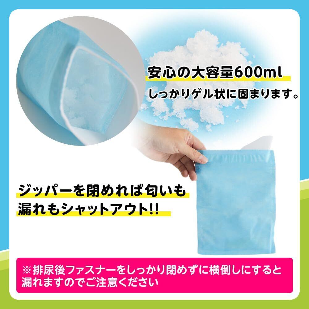 【消臭凝固剤】おしっこで凝固剤が飛び散らないように水に溶けるフィルム入り。凝固剤増量でしっかり固まる。ファスナー付きで臭いをシャットアウト。使用後は中身の見えない黒色持ち帰り袋に入れるだけ。
