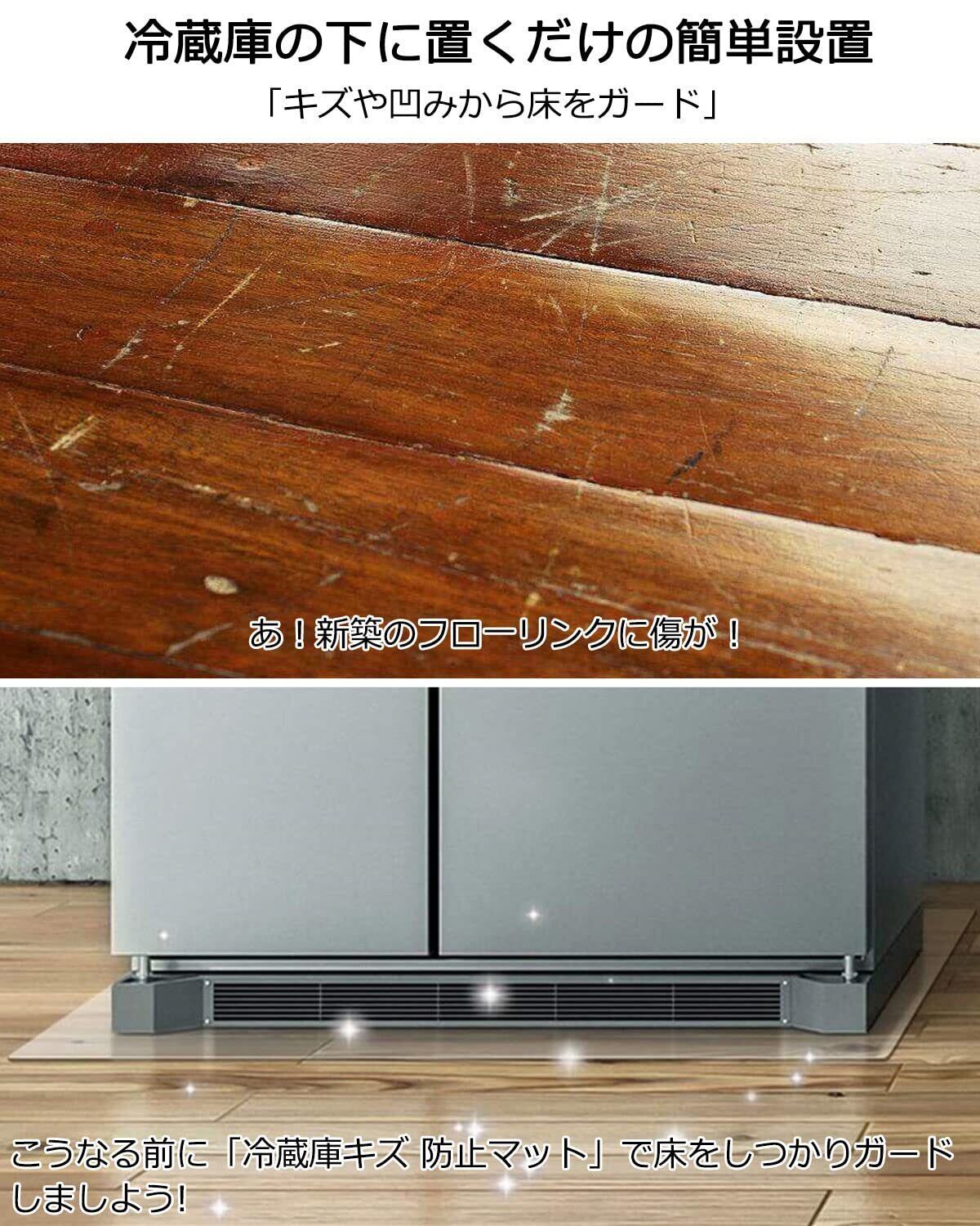 【冷蔵庫 傷防止マット】冷蔵庫マットは優れた耐衝撃性!耐荷重は約300kgと、ほとんどの冷蔵庫に対応し。冷蔵庫を置く際に床やフローリングから傷や凹みから守ります!重さわずか約700g(XSサイズ 49×60cm、厚さ2mm)で女性でも簡単に設置できます!四隅はお子様でも怪我をしないよう側面は滑らかに加工しています。