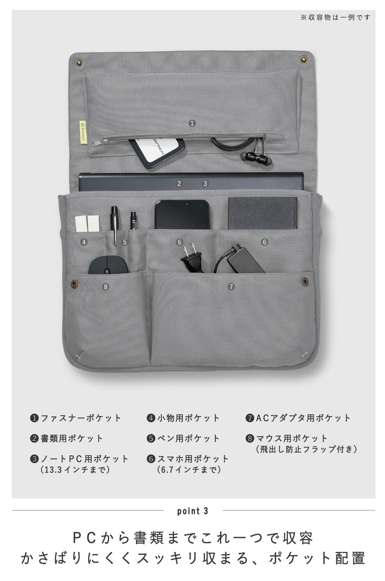 POINT3:PCから書類までこれ一つで収容。かさばりにくくスッキリ収まる、ポケット配置。