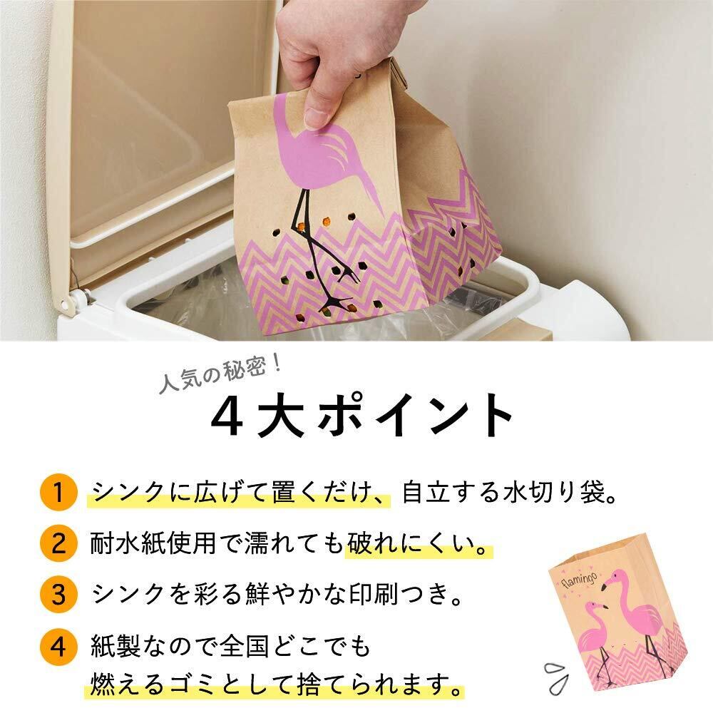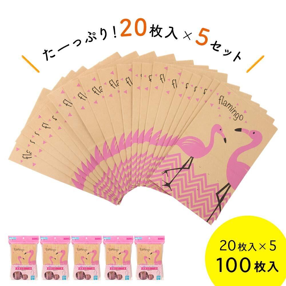 ネクスタ 水切り ゴミ袋 紙製 フラミンゴ柄 縦20×横13cm(底マチ9cm) 三角コーナー がいらない 水切り袋 日本製 自立 クラフト紙 - 20枚入5個セット