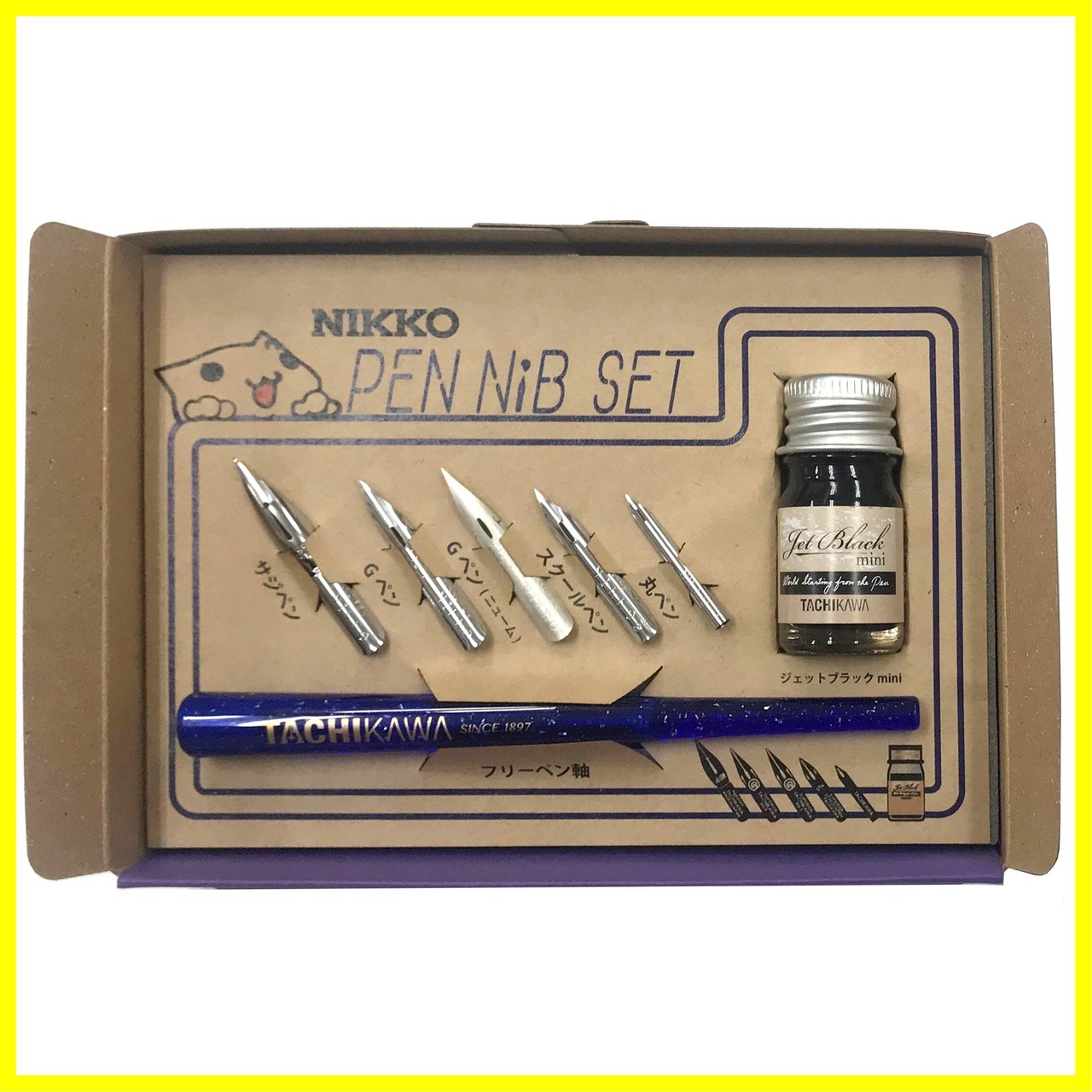 セット内容:日光サジペン・Gペン・Gペン(ニューム)・スクールペン・丸ペン、タチカワPフリーペン軸、タチカワジェットブラックインクmini 5ml、ミニ原稿用紙4枚