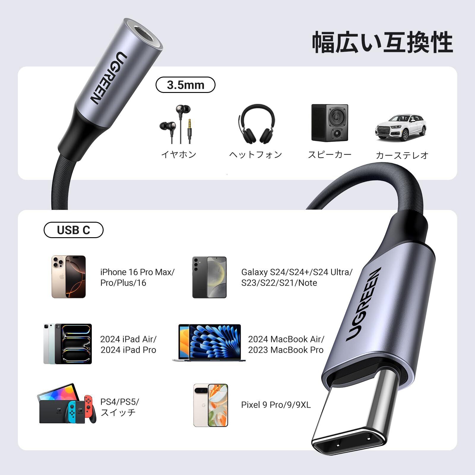 UGREEN【ハイレゾ音質】 USB C イヤホンジャック変換 USB C-3.5mm イヤホン変換アダプター DAC搭載 24bit/96KHz対応 TRRS/4極 ナイロン編み 音量調節/通話/音楽対応 iPhone17/16/15/iPad Pro/Android/Type Cなど機器に適用 シルバー
