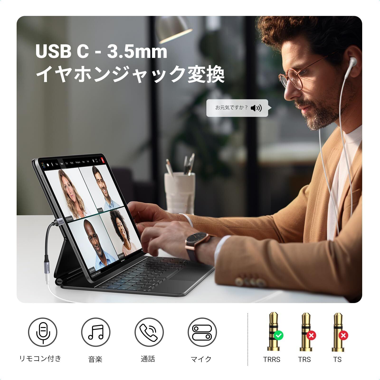 【多機能・多用途を持つ一品!】UGREENこのUSB C イヤホンジャックはインラインコントロールに対応により、音楽の再生・停止やボリューム操作ができてとても便利。マイク付きのイヤホンを使えば通話もできます。オーディオとマイクの両方の機能に対応しており、ゲーム、ナビゲーションにも便利になり、TRRSの3.5mmマイクでの使用にも特徴。プラグ&プレイ、挿すだけで操作でき、使い勝手が向上。
