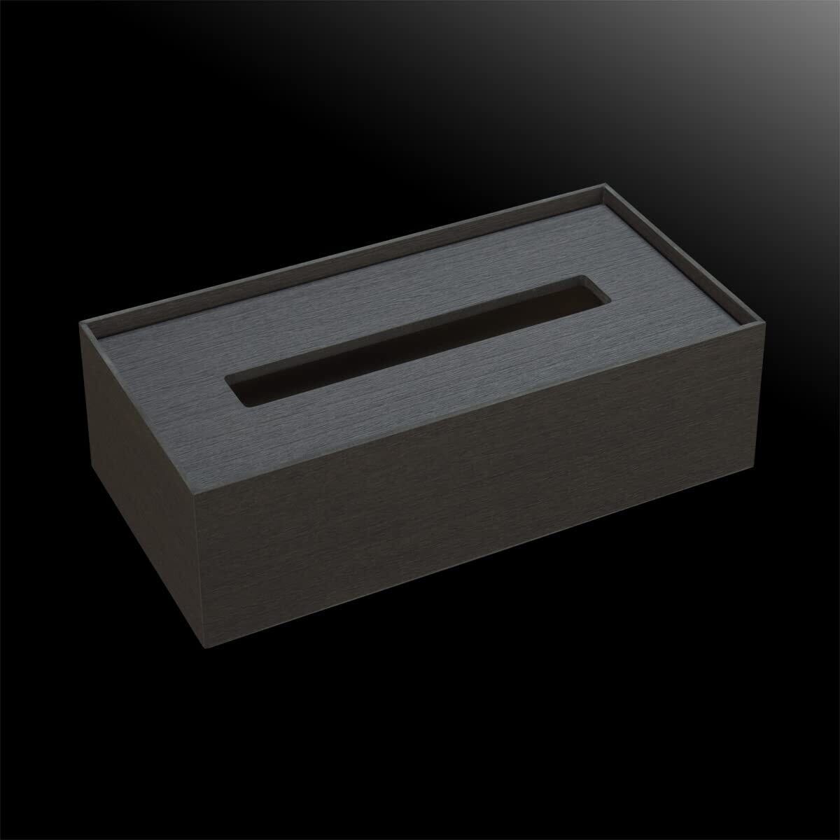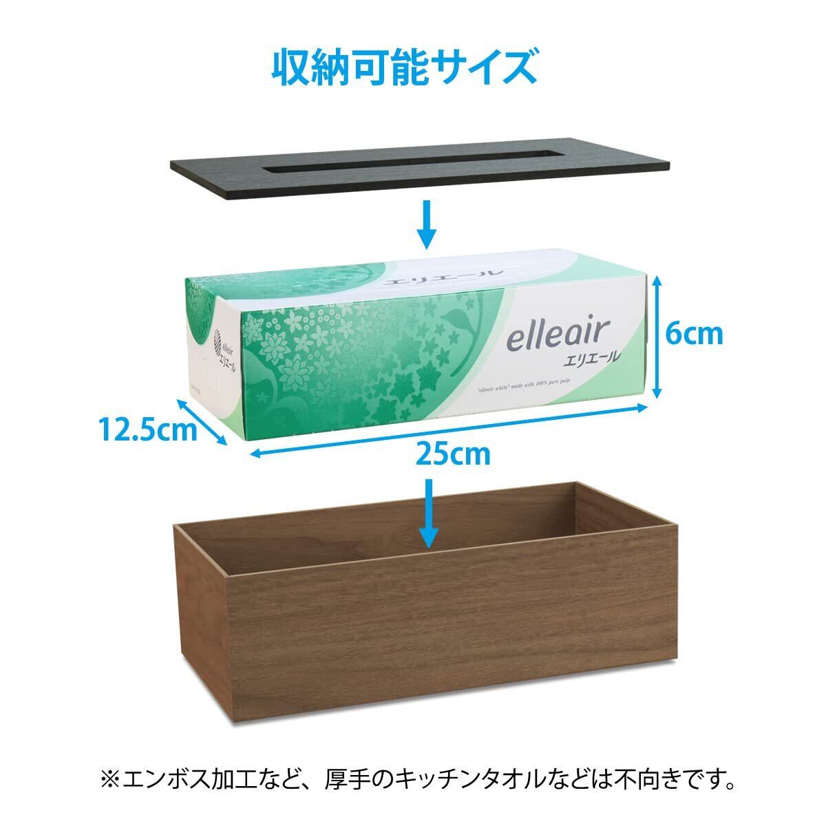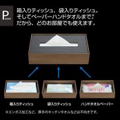 箱入りティッシュ、袋入りティッシュ。そしてペーパータオルまで。(エンボス加工など、厚手のキッチンタオルなどは不向きです。)だから、どのお部屋でも使えます。●衛生管理に気をつかうことが多い昨今、ティッシュの使用頻度も高まっています。だから、デザインや構造は、できるだけシンプルで使いやすいことに重点を置いて作りました。箱入りティッシュ、袋入りティッシュ、そして薄手のハンドタオルペーパーの収納ができます。袋入りティッシュは残量が少なくなってもスムーズに取り出せるよう、天板のカバーは落とし蓋式です。また、ティッシュケースを持ち運ぶときに重く感じないよう、繊細な2.5mmの板材を使用して300gクラスの本体重量を実現。天板カバー部分は厚めの5.5mmの板材を使用し、各カラーともブラックに統一したコントラスト感のある仕様です。