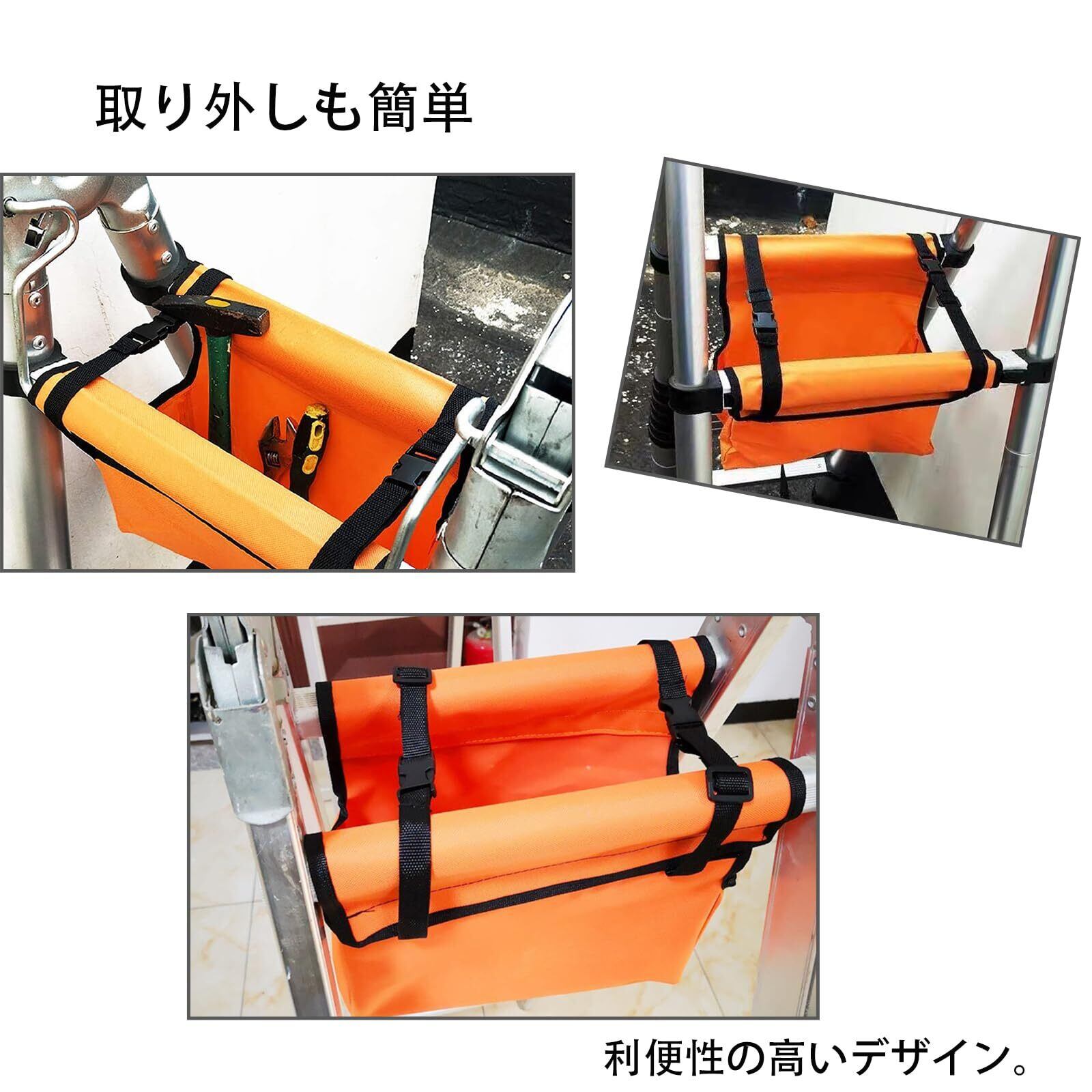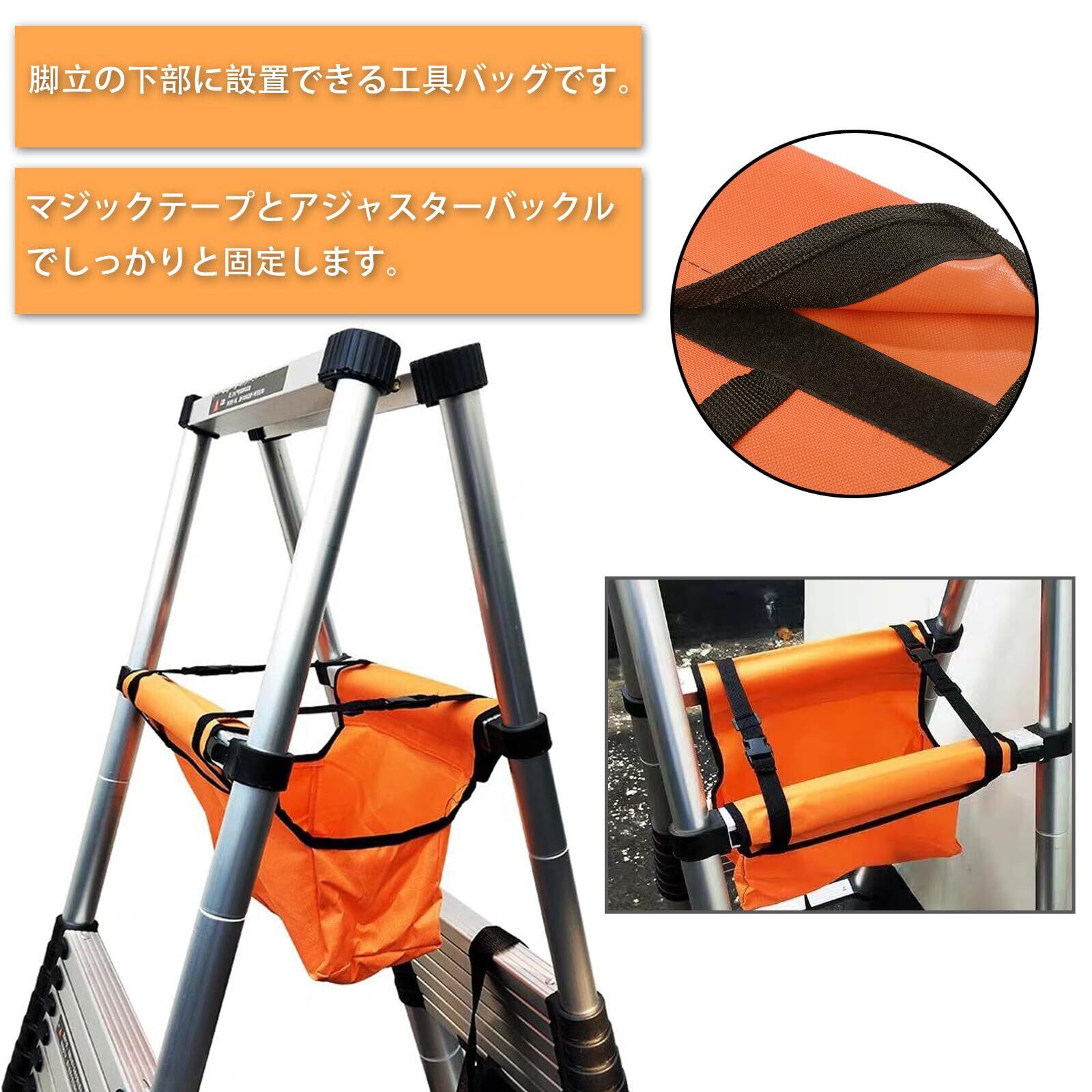 【簡単に取り付け可能! 大容量収納】脚立の下部に設置できる工具バッグです。マジックテープとアジャスターバックルでしっかりと固定します。取り外しもお手軽な、着脱式の収納袋です。