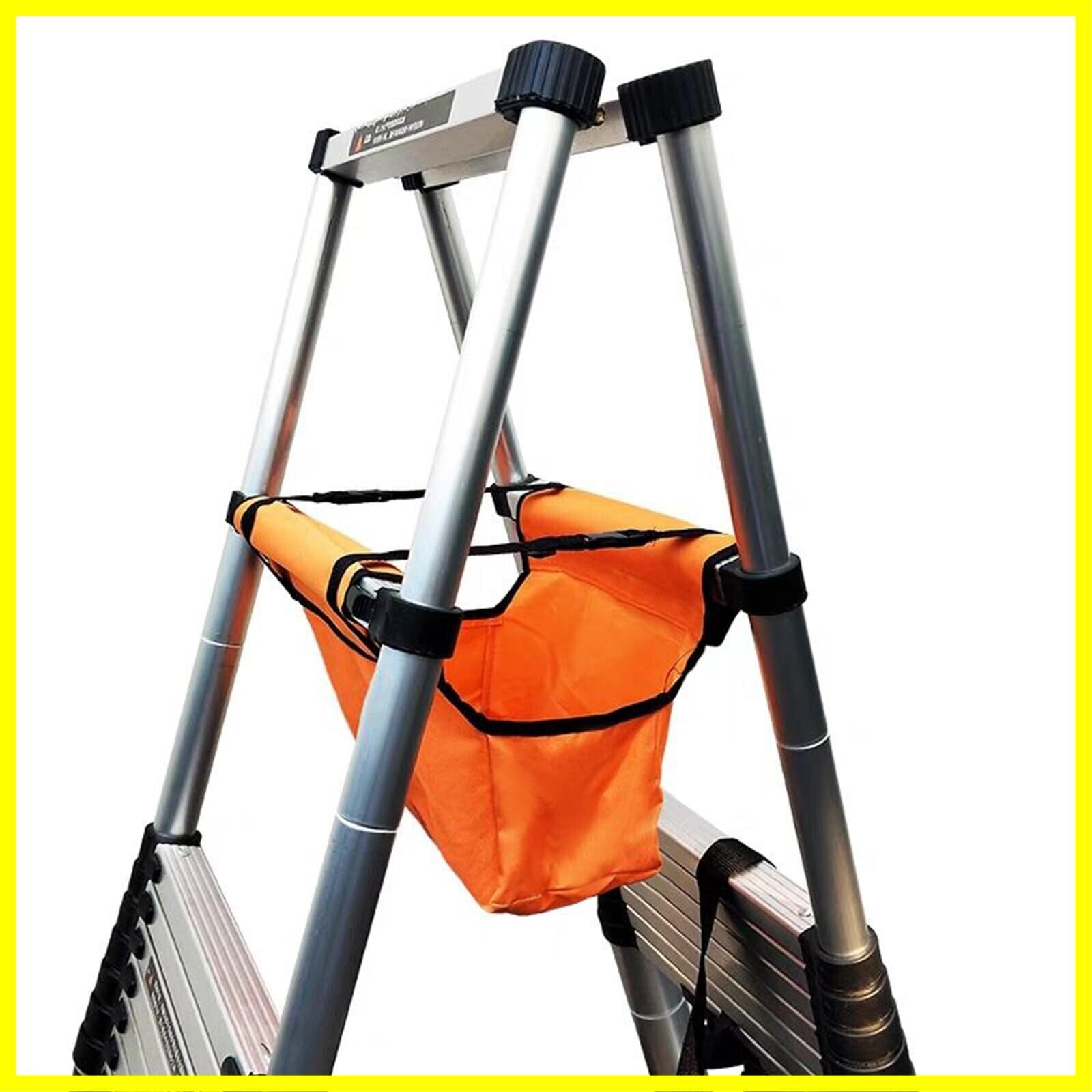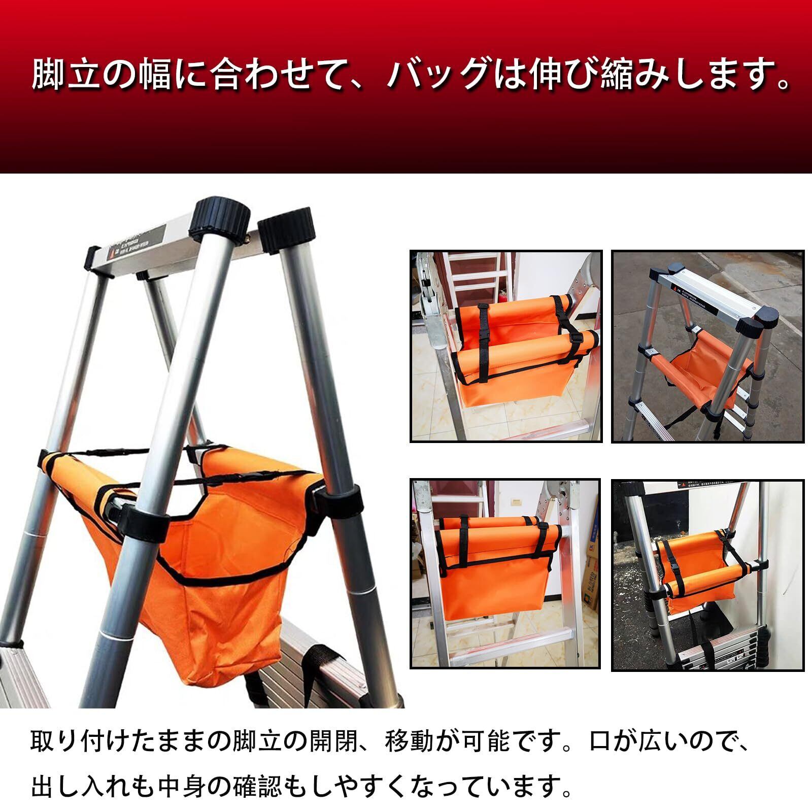 【シンプルかつ利便性の高いデザイン】脚立の幅に合わせて、バッグは伸び縮みします。そのため、取り付けたままの脚立の開閉、移動が可能です。口が広いので、出し入れも中身の確認もしやすいデザインになっています。