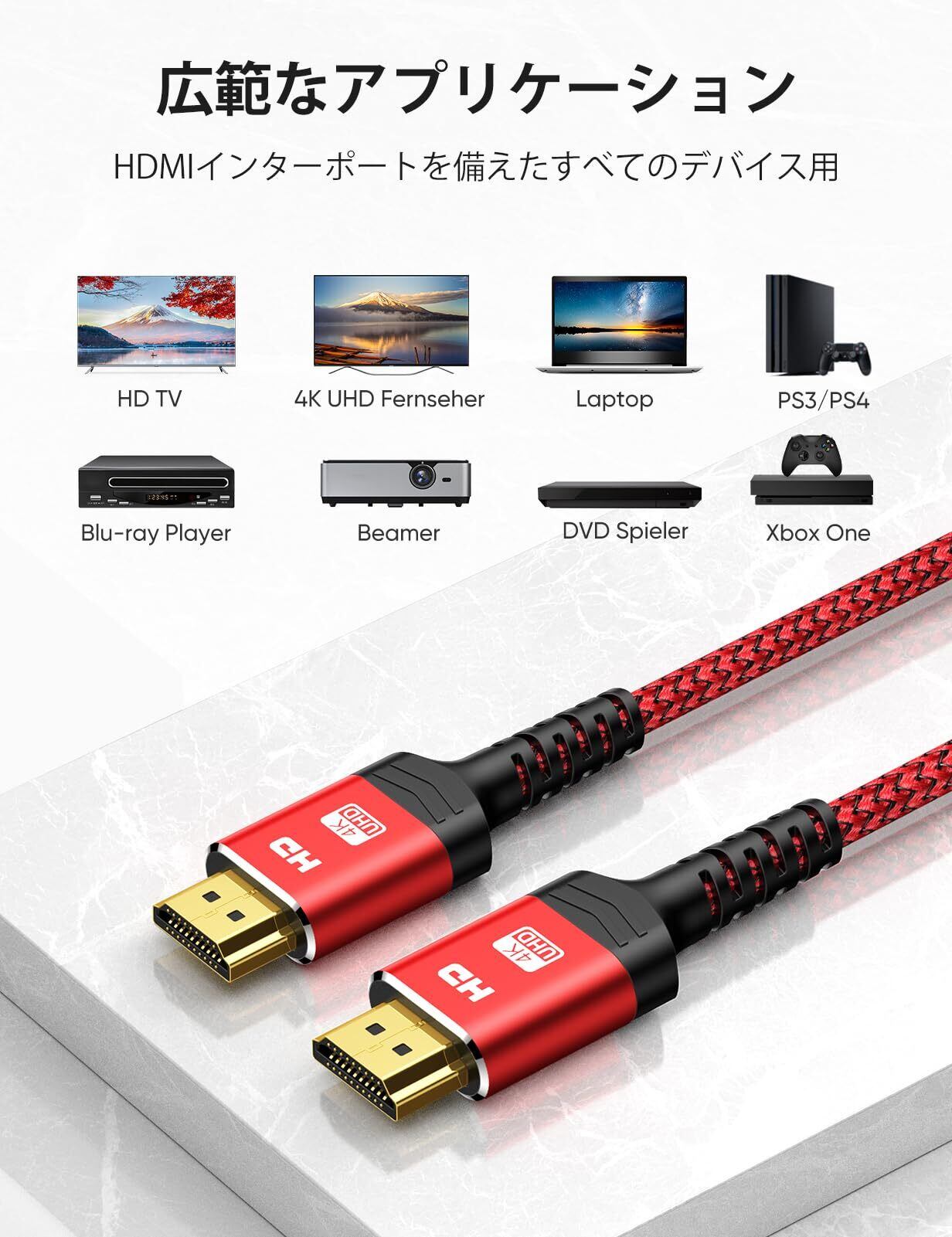 【HDMI Ver2.0基準】このHDMI ケーブルはHDMIVer2.0基準に適合(60Hzで4K対応、2160p、色深度48bit/px)。最大帯域幅18Gbpsまでサポート。hdmi Ver1.4などの旧バージョンとの互換性有ります。