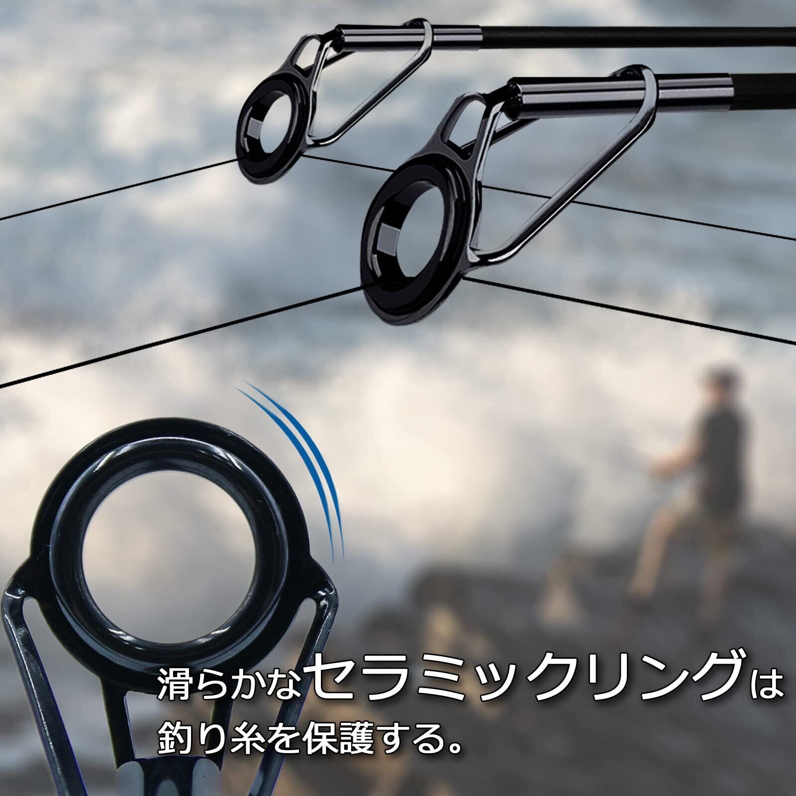 【釣りライン保護用セラミックリング】 ロッドガイドに埋め込まれた滑らかなセラミックリングは、摩擦による釣りライン切れのリスクを大幅に軽減します。 また、ラインがより自由に動くようになります。