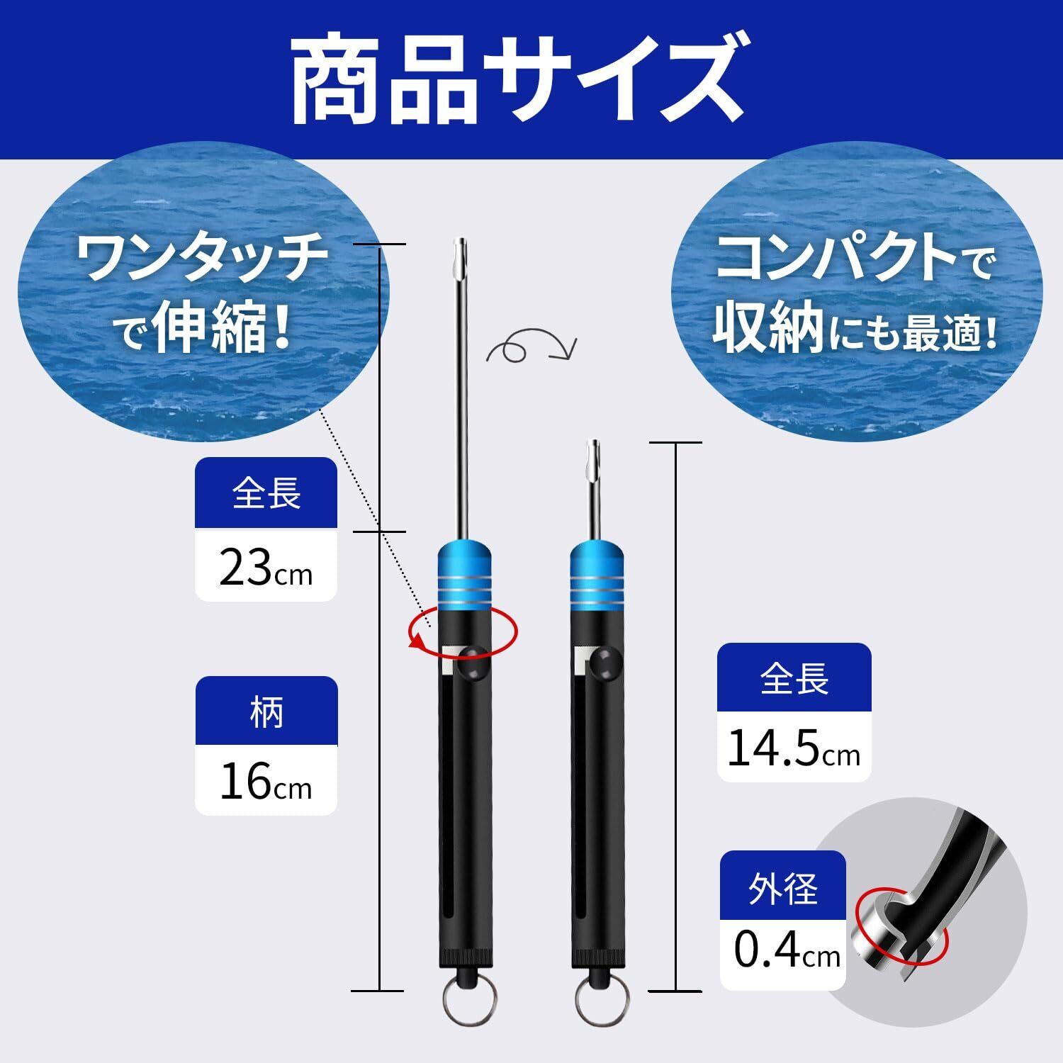 収納式のフックリムーバー(フックリリーサー)は釣り針を外すのに最適なツールです。 伸縮して収納出来るため持ち運びの邪魔になりません。 38gと超軽量型で見た目もシンプルで使いやすいです。 ステンレス製なので耐摩耗性、耐錆性に優れています。 【サイズ】全長:23cm/柄の部分:16cm 【素材】針部分:ステンレス/ハンドル部分:アルミ製 【カラー】ブラック/ブルー/ゴールド