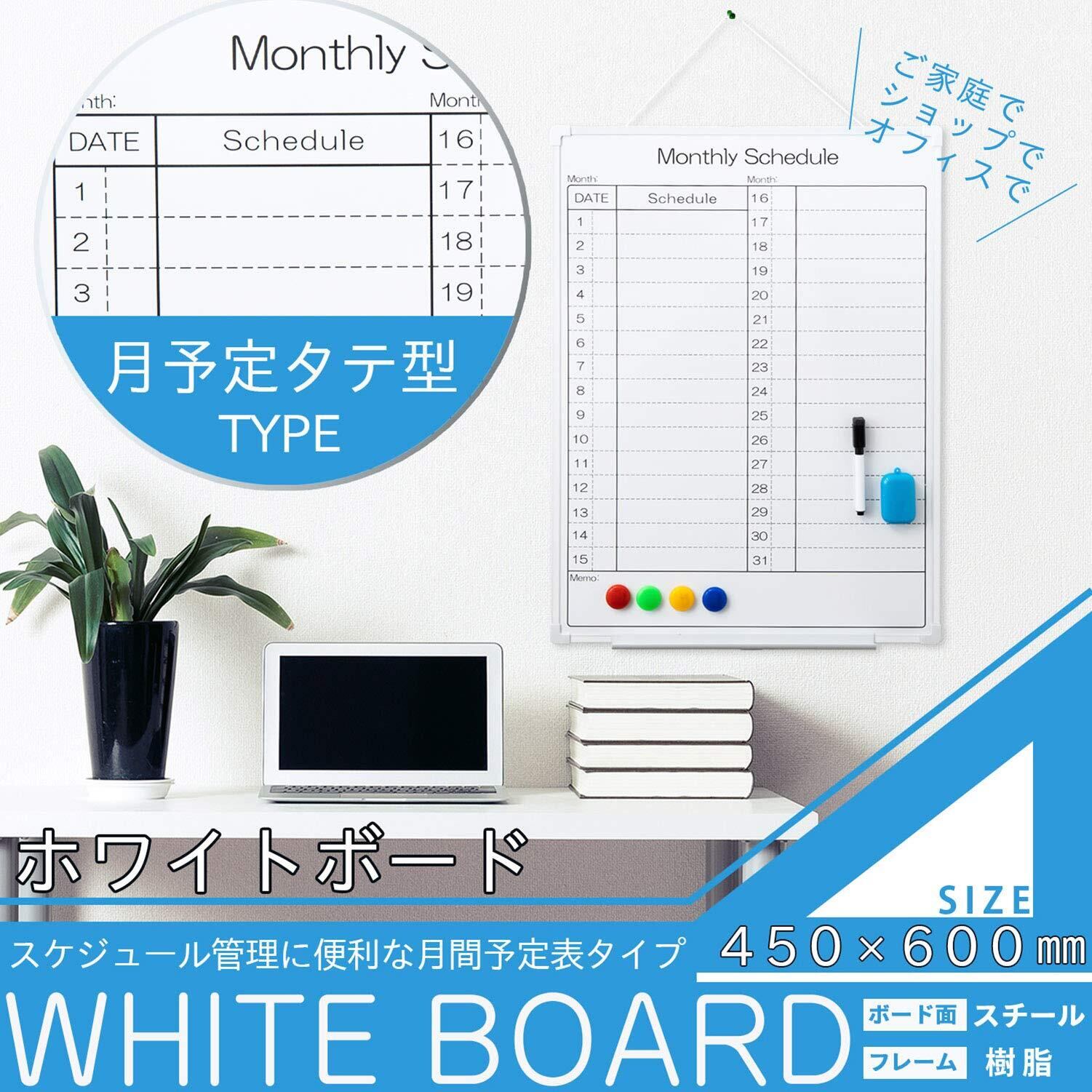 軽くて扱いやすい「幅450mm×高さ600mmサイズ」。スケジュール管理に便利なタテ型月間予定表タイプの樹脂枠ホワイトボード。