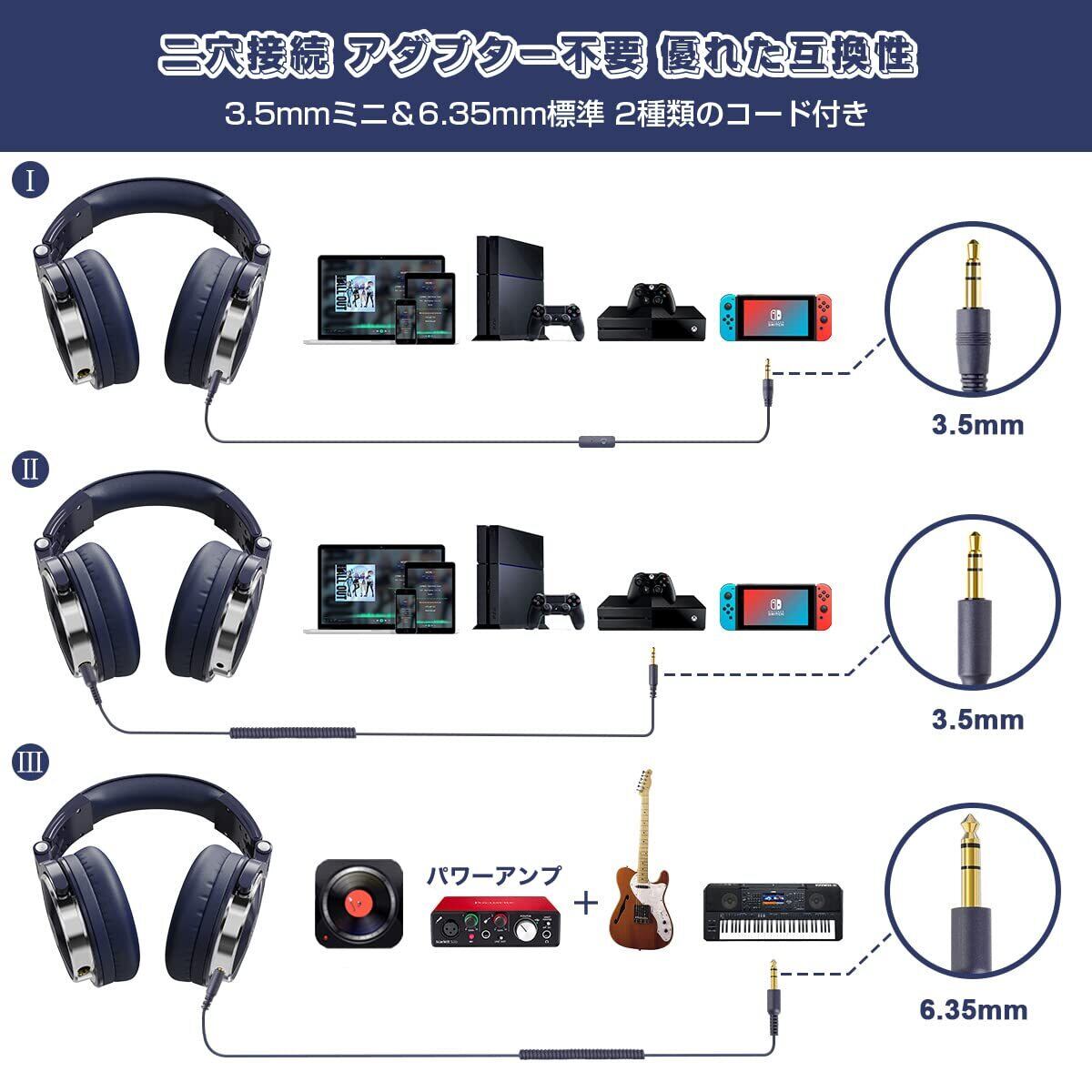 【二穴接続・音楽シェア】ヘッドホンの両側に6.35mmと3.5mmジャックが共存し、ケーブルも2本付属しております、1台の機器のステレオ音楽を複数の人と同時に楽しめる。楽器と接続した場合、パワーアンプによってヘッドホンの機能が最大限度まで再現可能。