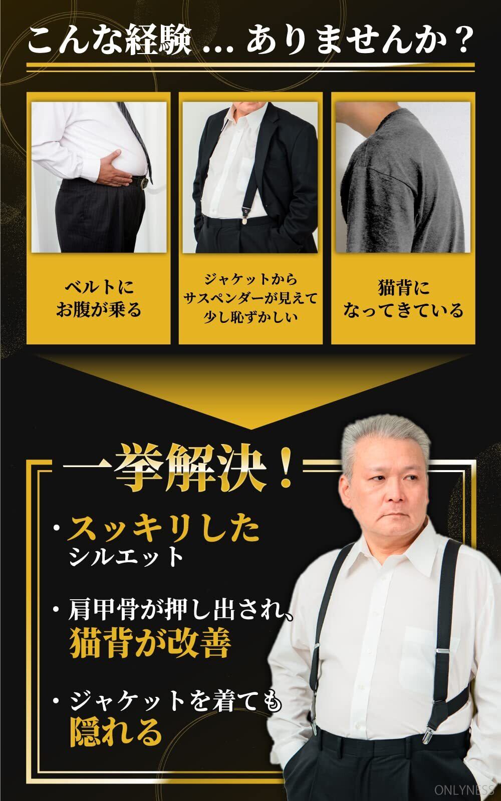 【フィット感&姿勢改善】 背中でクロスしているためズレ落ちず、X型やY型サスペンダーと比べ肩が凝りづらくなります。また、肩甲骨をグッと押し出してくれる為、猫背になりづらく姿勢改善に繋がります。