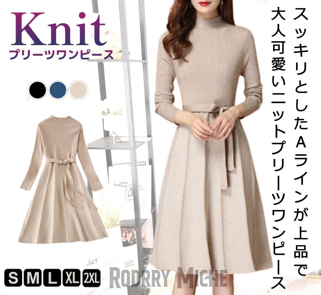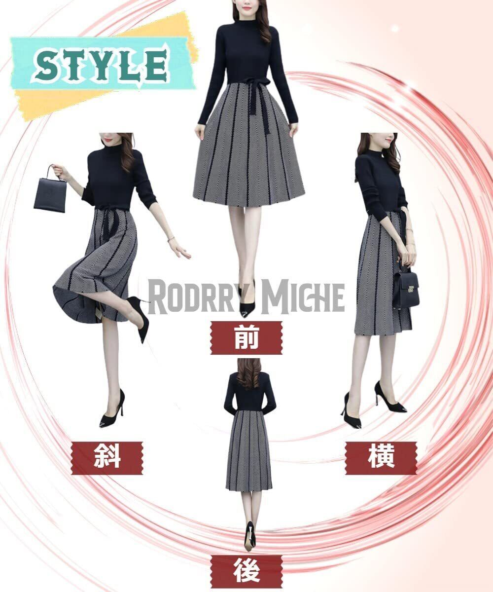 [ロドリーミシェ] ニット 切り替え プリーツ ウエストリボン ベルト 付き キレイメ ワンピース ドレス