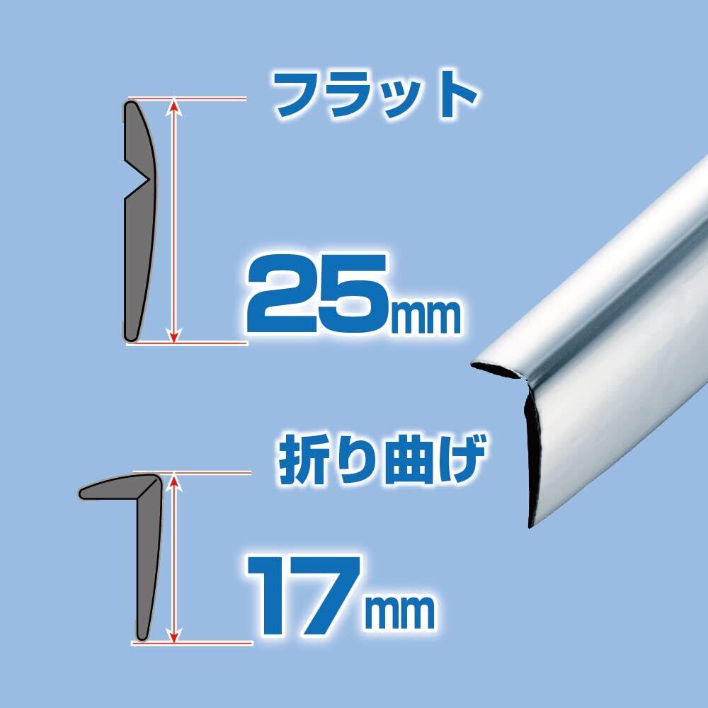 断面がL型にも曲がりメッキが際立つドレスアップ用モール。ラジエターインテークフィンやドア下をさりげなく演出。フラットで25mm / 曲げて17mm (全長2mの1本巻)