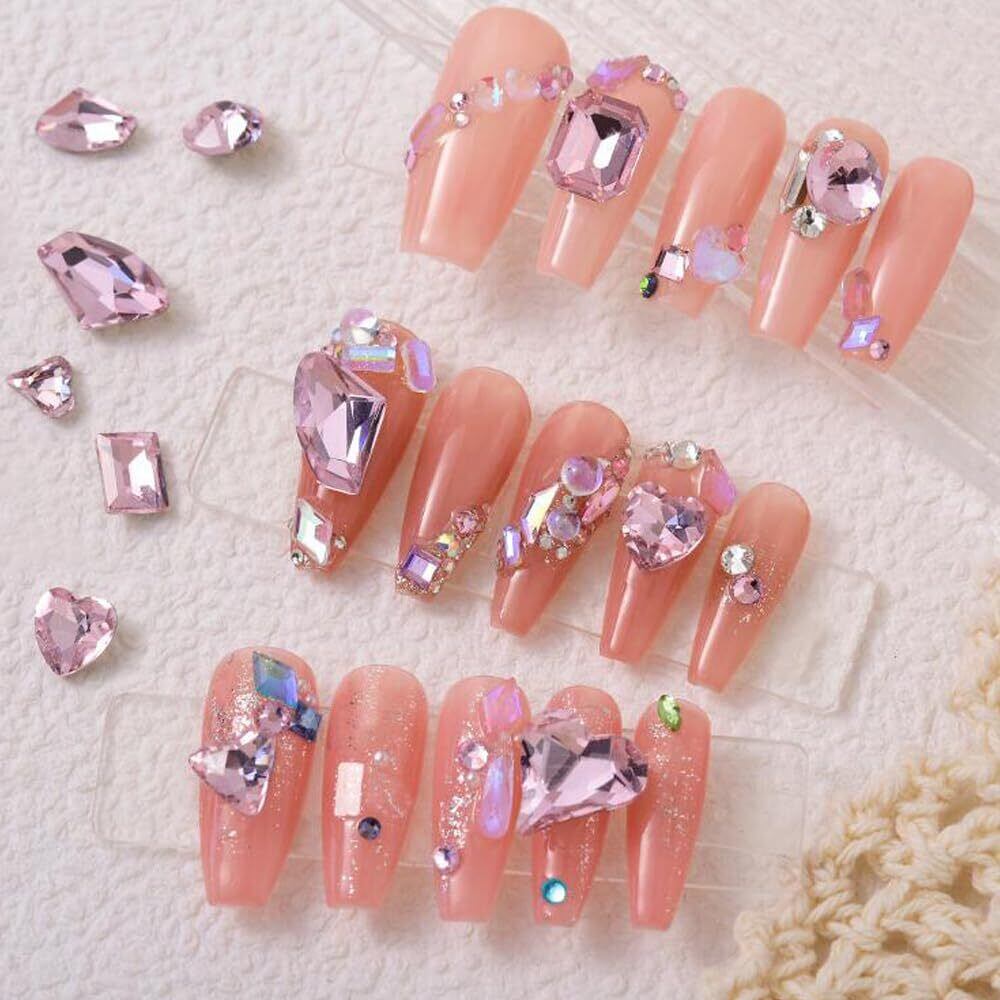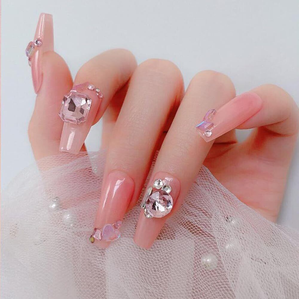 【キラキラ】カットが綺麗で輝くガラスストーンは光沢が美しく、高級感があります。ハートのラインストーンは指先をキラキラ輝かせます。