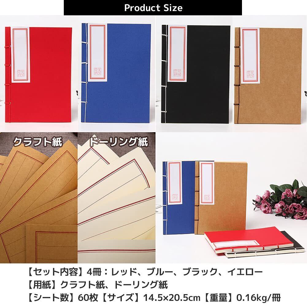 【セット内容】4冊:レッド、ブルー、ブラック、イエロー【用紙】クラフト紙、ドーリング紙【シート数】60枚【サイズ】14.5×20.5cm、縦罫線8行、行幅1.5cm【重量】0.16kg/冊